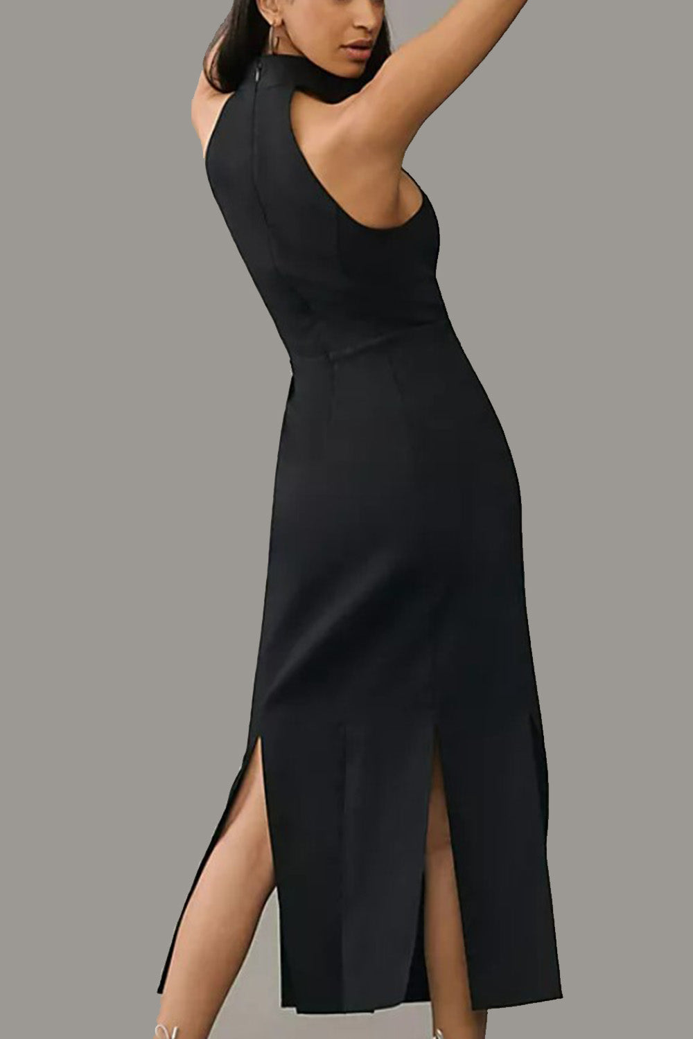 Type-Ethereal Black Dress, Color-Black, Neck type-Halter neck, Sleeve Length-Sleeveless, Fit-Body Fit, Fabric-Poly Lycra
