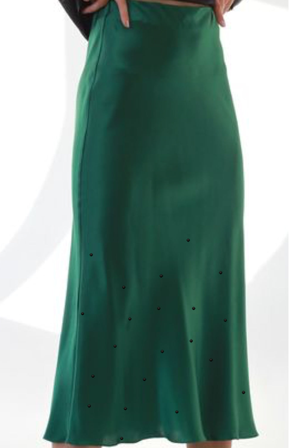 Bored of the regular cotton skirts? We’ve got some interesting satin ones for you! Green ankle-length skirt with scattered black pearl details in the bottom front. A- line silhouette and high waist. Satin is smooth, slightly lustrous and comfortable wear for any season.