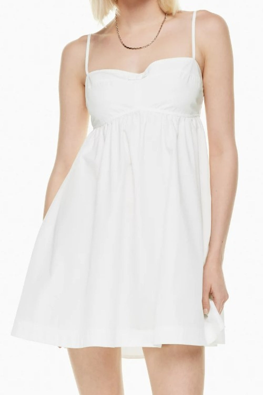 Type - Exultant White Dress, Color - White, Neck type - Sweetheart neck, Sleeve Length - Sleeveless, Fit - Regular, Fabric - Poplin