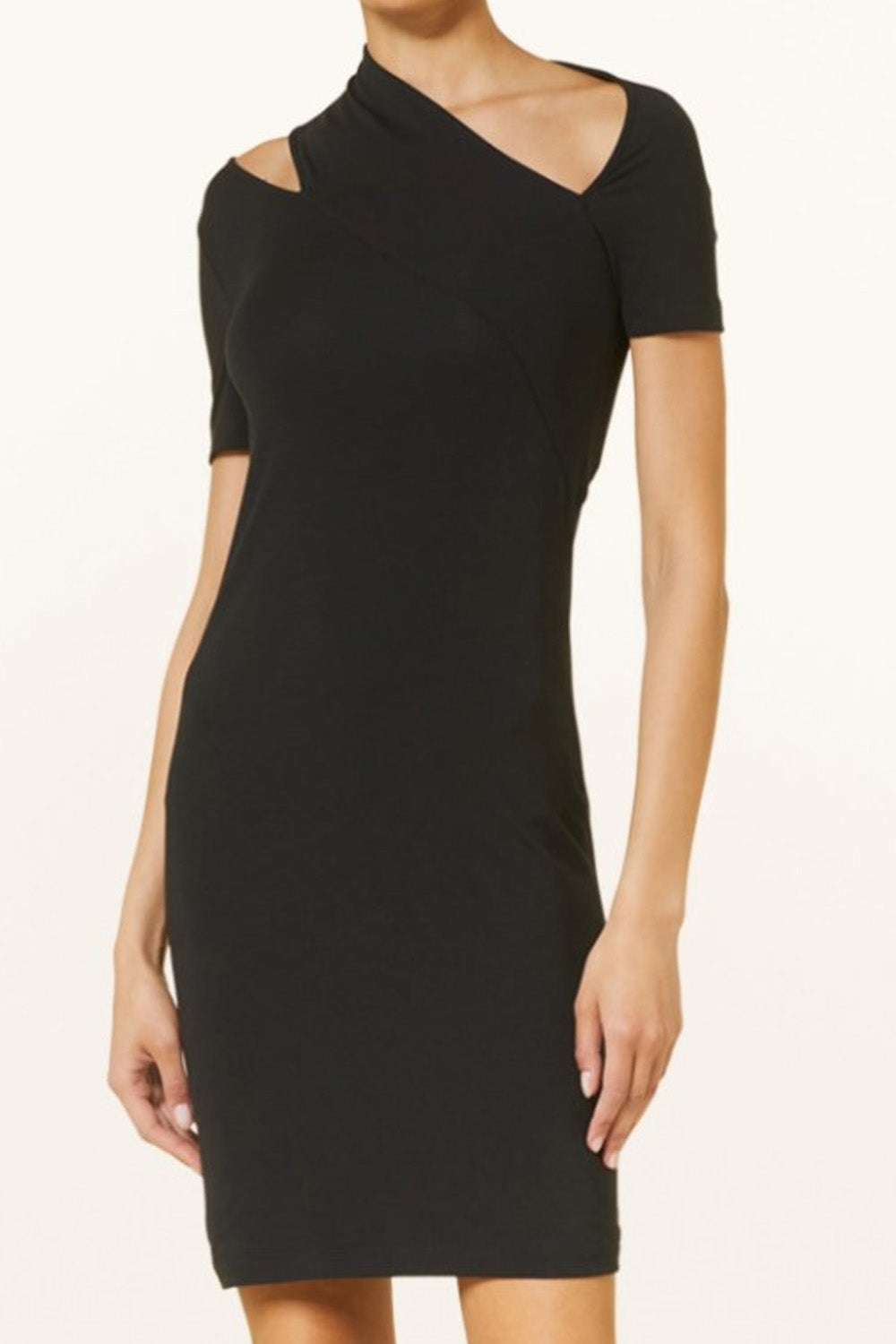 Type-Fauna Black Dress, Color-Black, Neck type-Asymmetric neck, Sleeve Length-Half Sleeve, Fit-Body Fit, Fabric-Poly Lycra