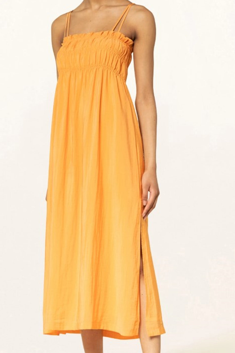 Type-Firma Orange Dress, Color-Orange, Neck type-Square neck, Sleeve Length-Sleeveless, Fit-Regular, Fabric-Poplin