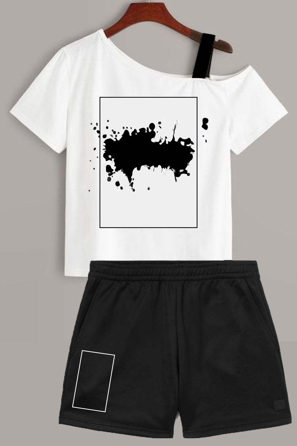 These combo sets are made to bring out the younger version of you. Feel playful in this white off-shoulder top with a contrast print and black shoulder strap. Black shorts with a rectangle print on the right leg is an easy wear for this summer.