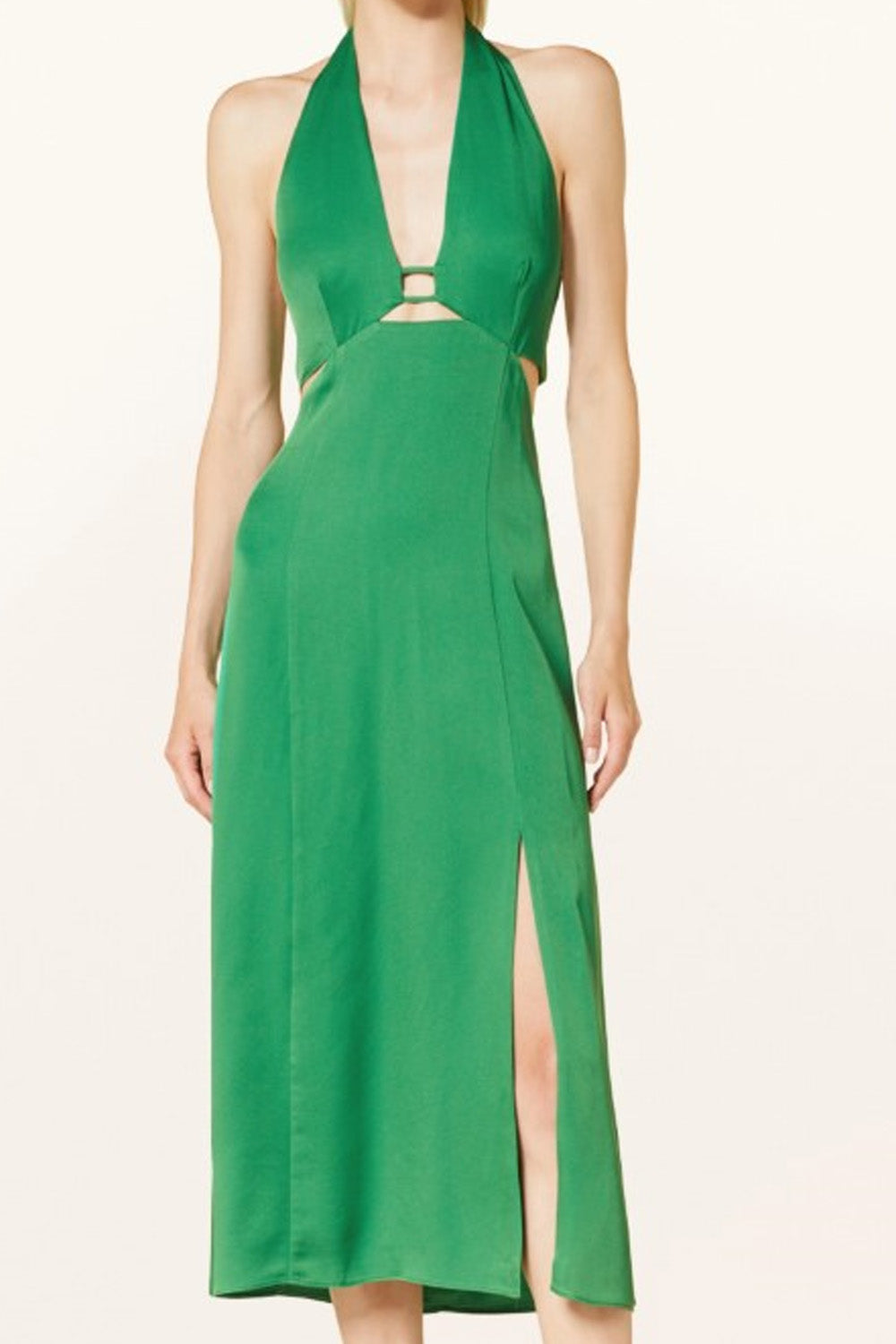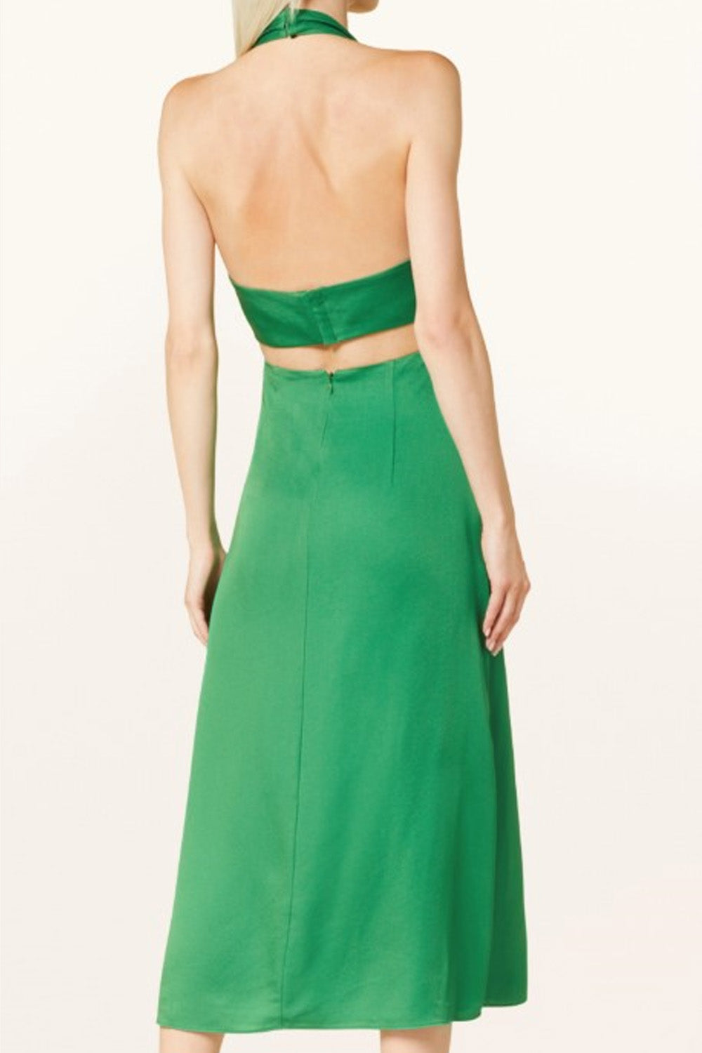 Type-Flora Green Dress, Color-Green, Neck type-Halter neck, Sleeve Length-Sleeveless, Fit-Regular, Fabric-Satin Lycra