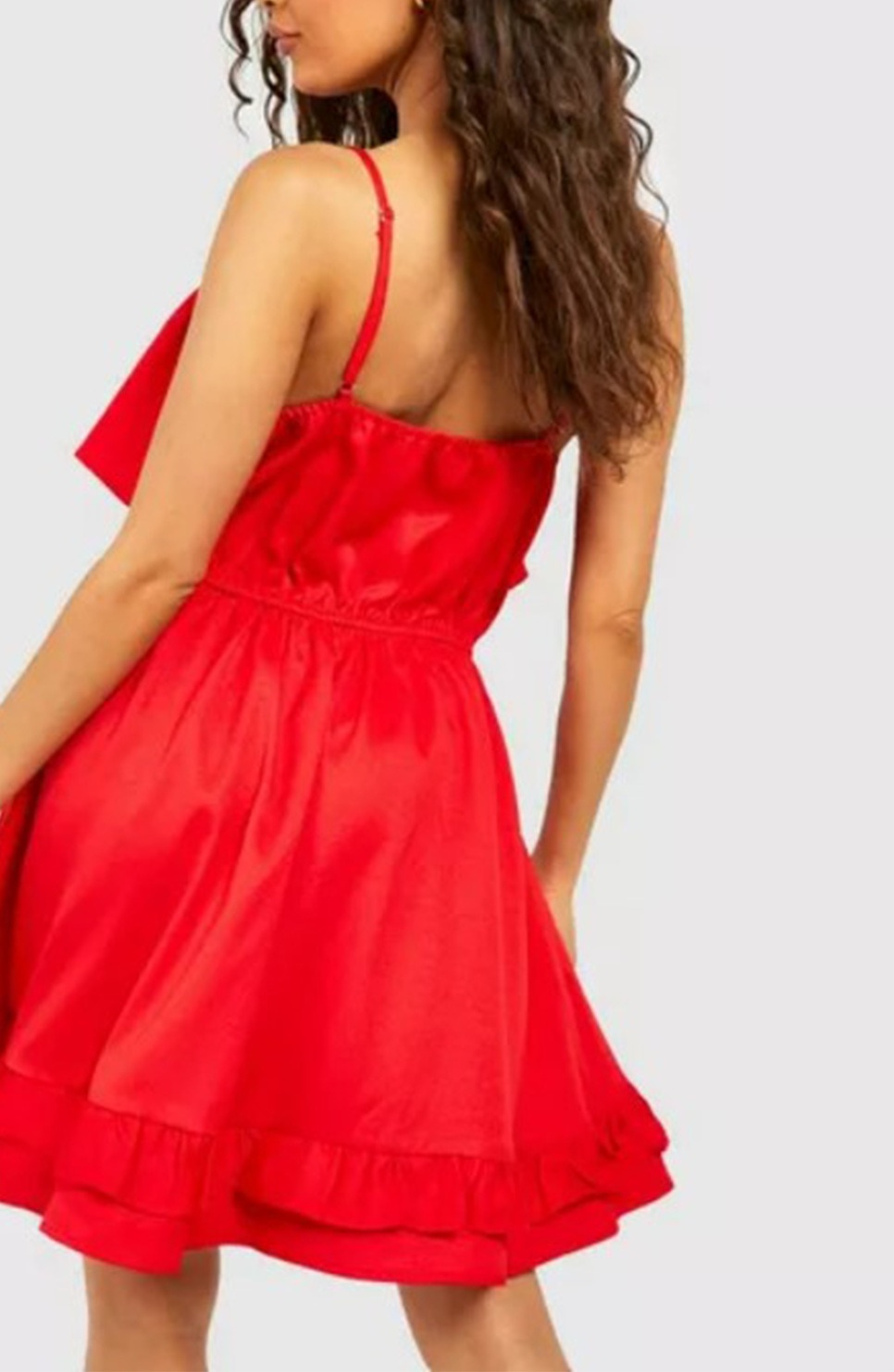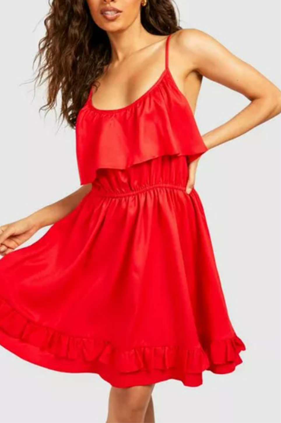 Type-Foxy Red Dress, Color-Red, Neck type-Scoop neck, Sleeve Length-Sleeveless, Fit-Regular, Fabric-Rayon