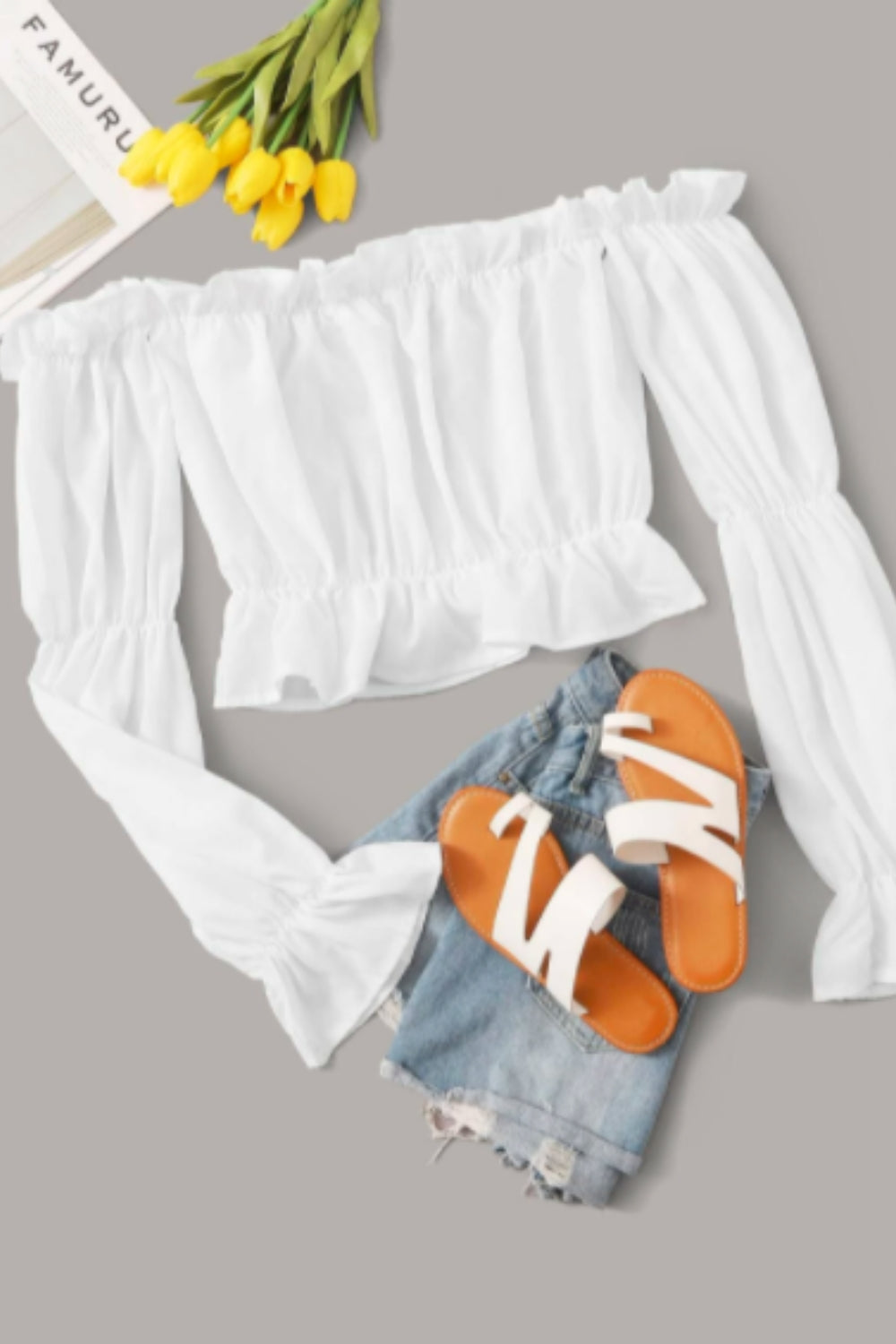 SKU:FrillFlounceSleeveBardotBlouse-XS