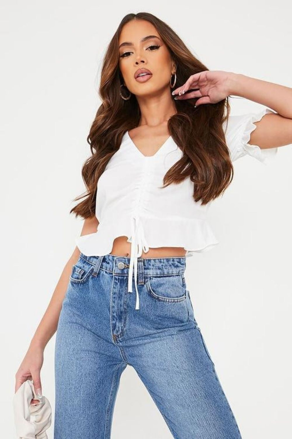 Type- Frilled Hem White V neck Top