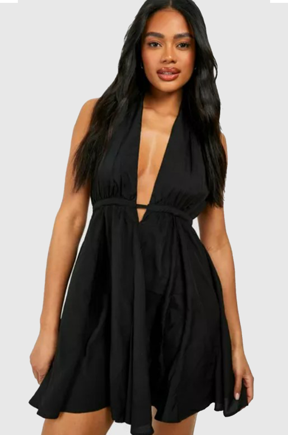 Type-Frolic Black Dress, Color-Black, Neck type-Deep V halter neck, Sleeve Length-Sleeveless, Fit-Regular, Fabric-Rayon