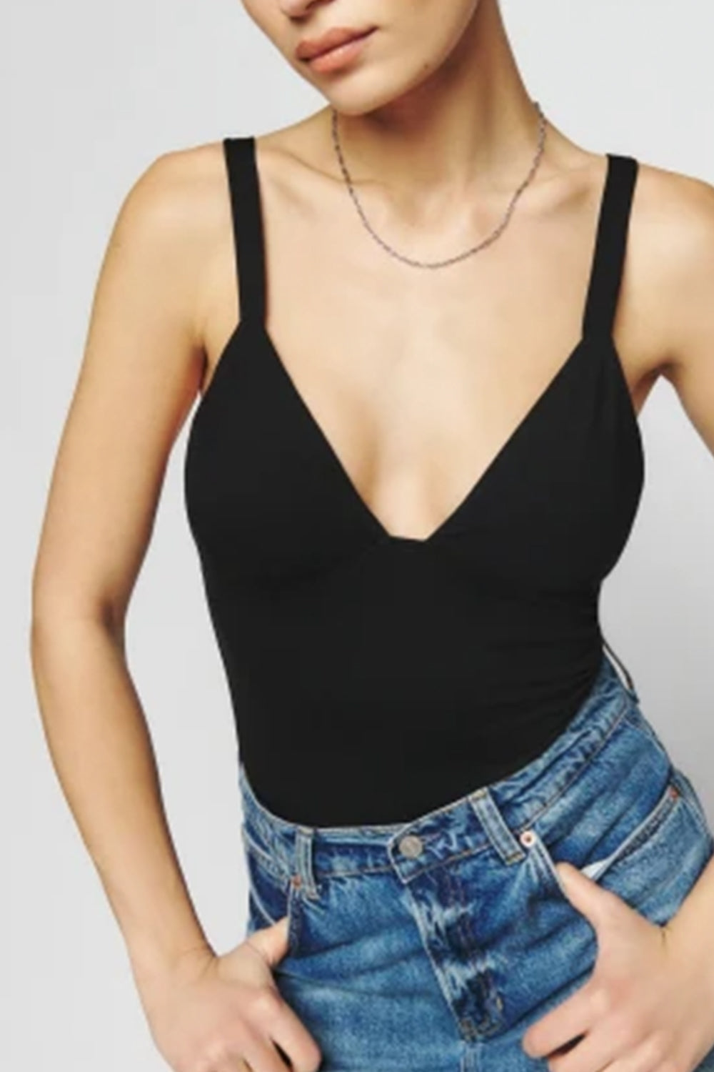 Type-Fulham Black Top Color-Black Neck type-V Neck Sleeve Length-Sleeveless Fit-Body Fit Fabric-Poly Lycra