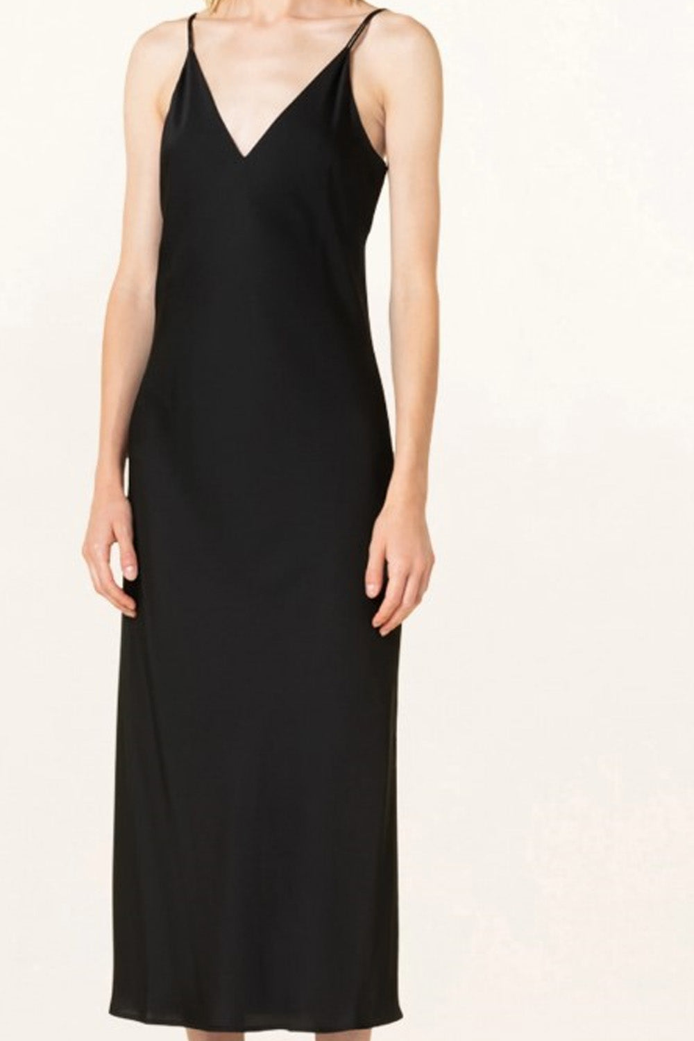 Type-Gaiety Black Dress, Color-Black, Neck type-V Neckline, Sleeve Length-Sleeveless, Fit-Relaxed, Fabric-Satin Lycra