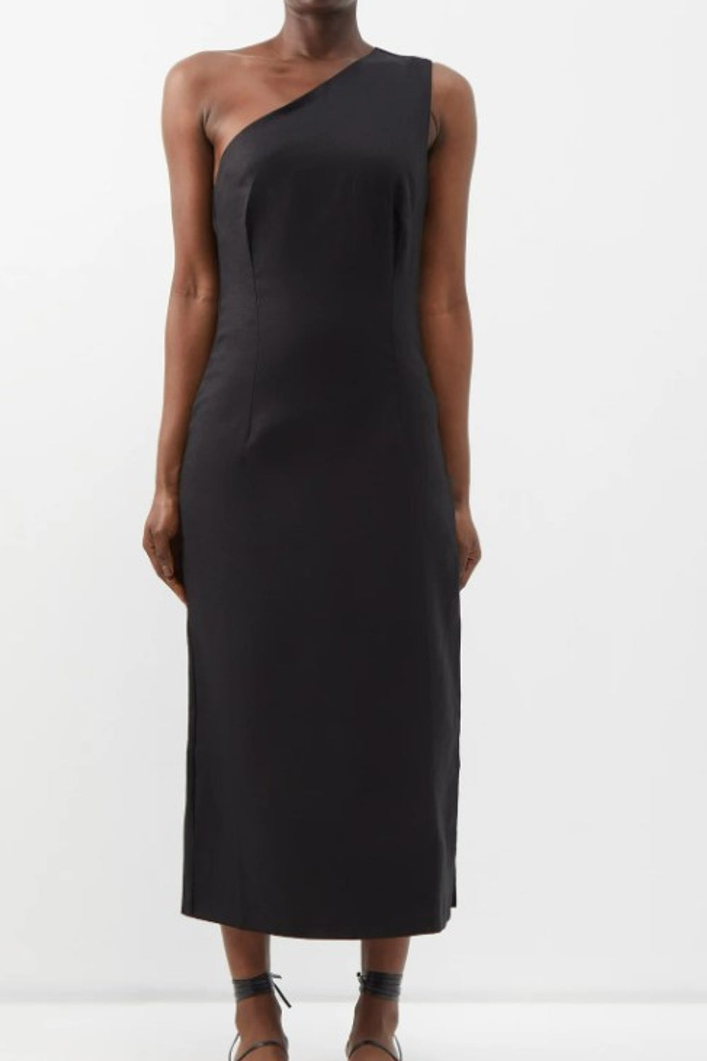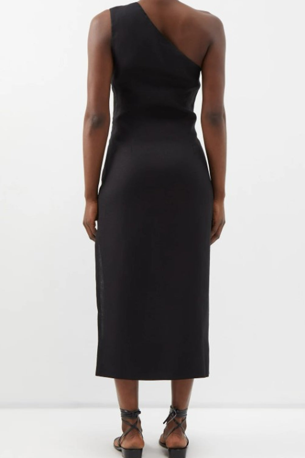 Type-Gangjin Black Dress, Color-Black, Neck type-One Shoulder Neck, Sleeve Length-Sleeveless, Fit-Body Fit, Fabric-Poly Lycra
