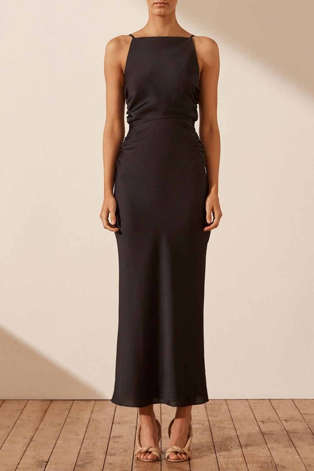 Type-Gapyeong Black Dress, Color-Black, Neck type-High Square neck, Sleeve Length-Sleeveless, Fit-Body Fit, Fabric-Satin Lycra