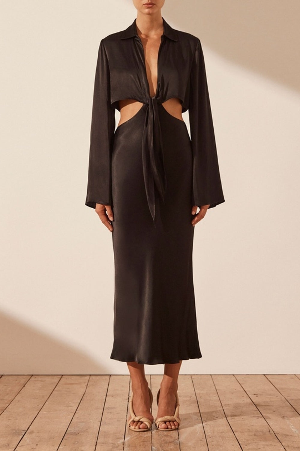 Type-Gimje Black Dress, Color-Black, Neck type-Plunging Collar neck, Sleeve Length-Full Sleeve, Fit-Body Fit, Fabric-Satin Lycra