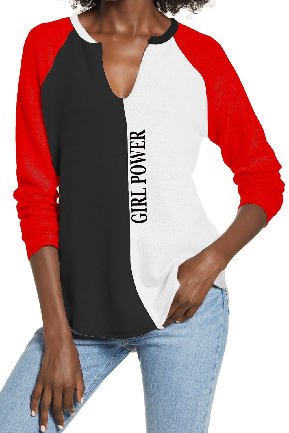 Colorblock being the trend of the season, sport this t-shirt confidently with shocking red, black and white blocked together. The front is cut in half with black on one side and white on the other and the back in black. The raglan full length sleeves are set in red, girl power is printed on its front to complete the look. You can pair this top with a skinny jeans and flats for a casual day out.