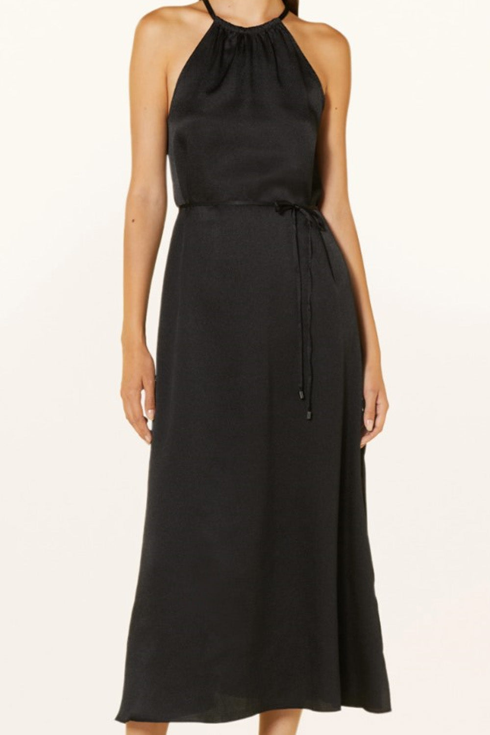 Type-Greenery Black Dress, Color-Black, Neck type-Halter neck, Sleeve Length-Sleeveless, Fit-Regular, Fabric-Satin
