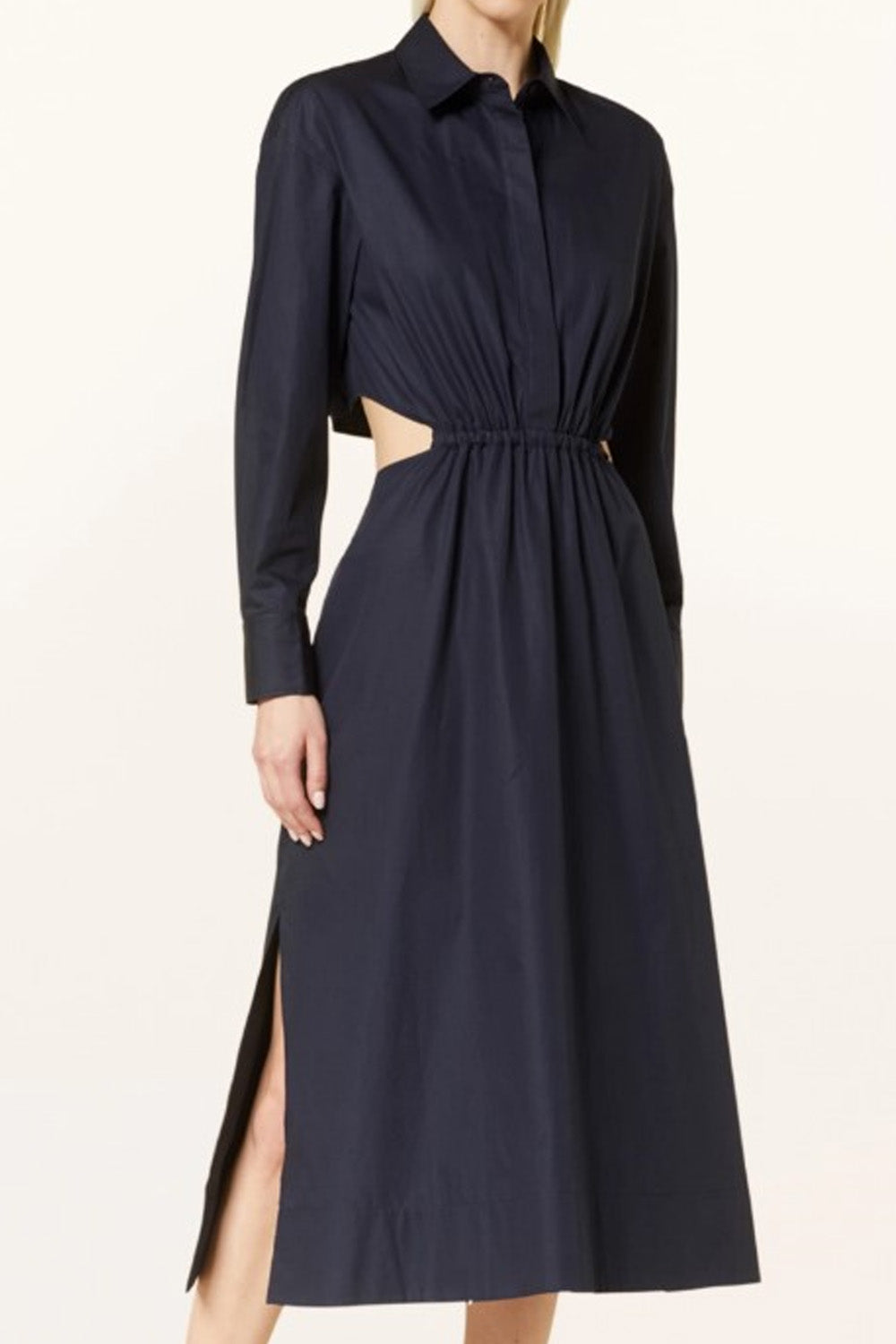 Type-Grit Navy Dress, Color-Navy, Neck type-Collar Neck, Sleeve Length-full length, Fit-Regular, Fabric-Poplin