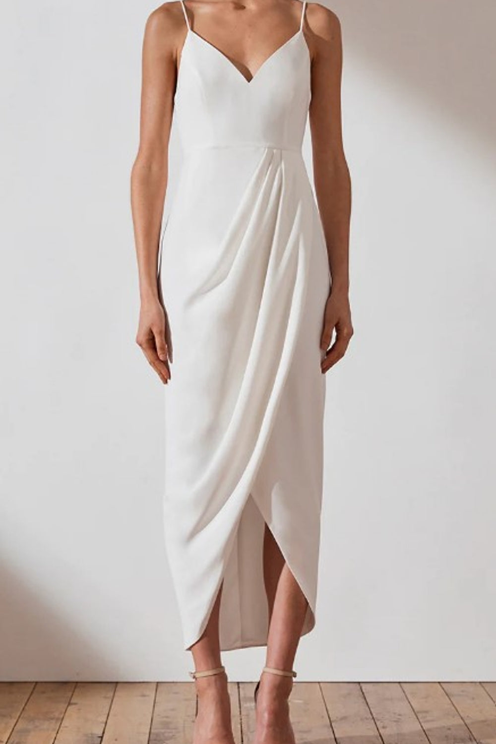 Type-Gunsan White Dress, Color-White, Neck type-V Neck, Sleeve Length-Sleeveless, Fit-Regular, Fabric-Satin Lycra