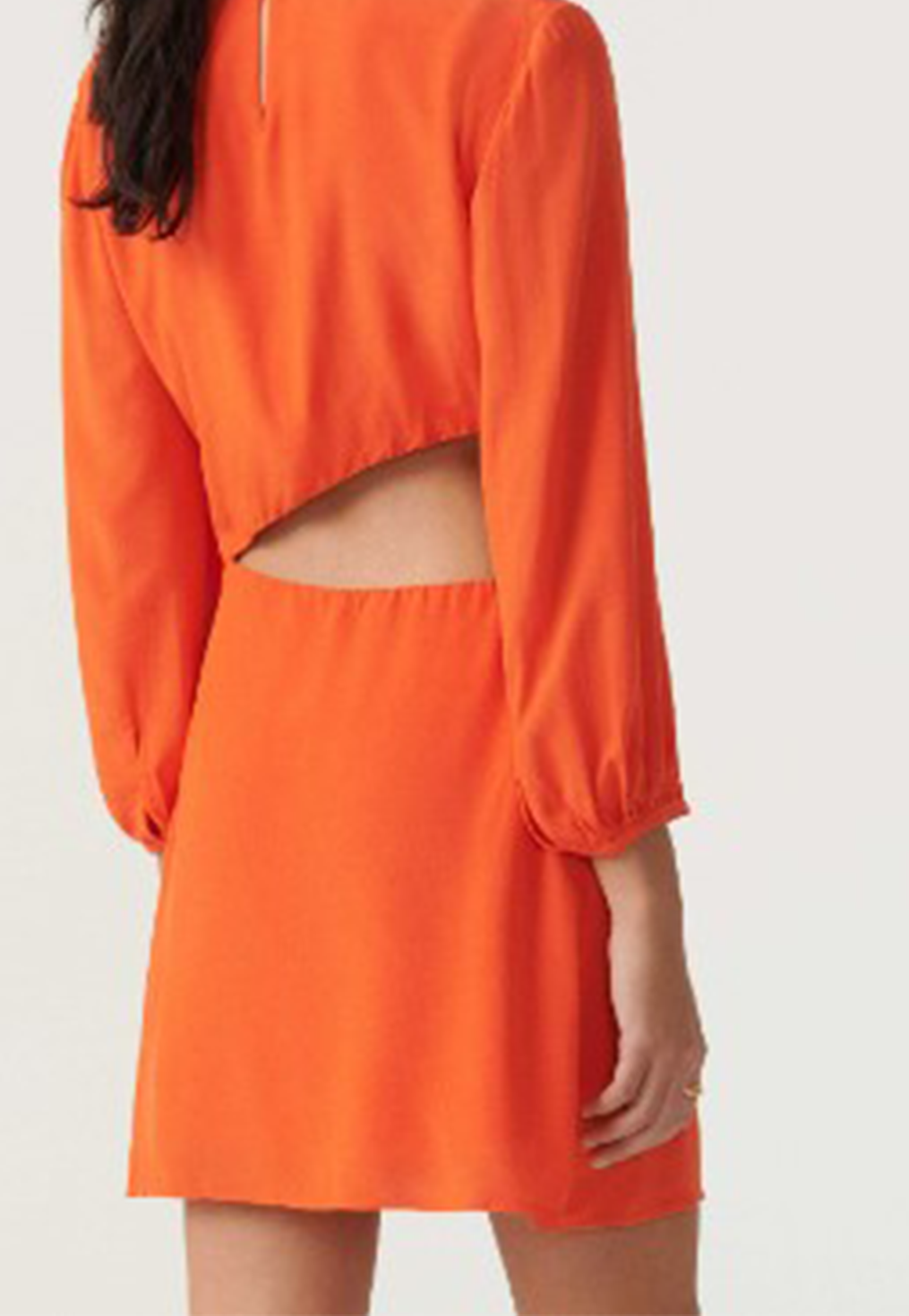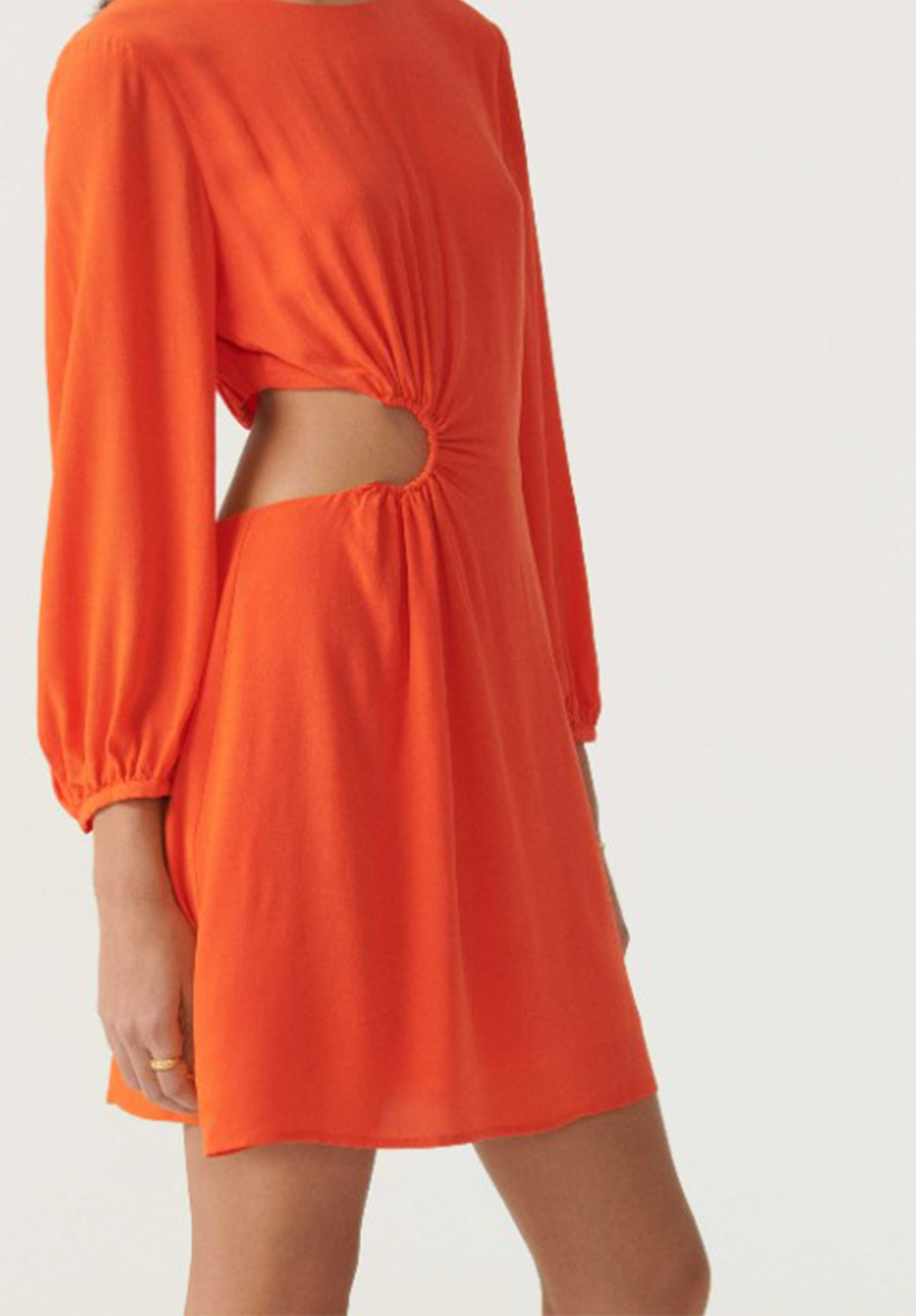 Type-Gutsy Orange Dress, Color-Orange, Neck type-Round neck, Sleeve Length-Three fourth, Fit-Body Fit, Fabric-Rayon