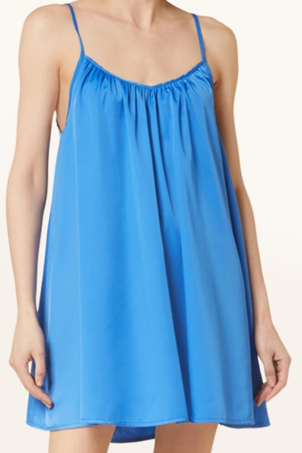 Type-Habitat Blue Dress, Color-Blue, Neck type-Round neck, Sleeve Length-Sleeveless, Fit-Regular, Fabric-Satin