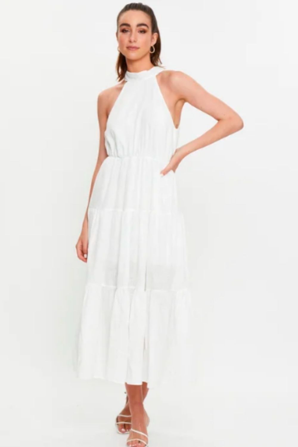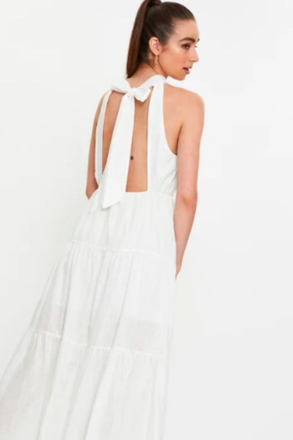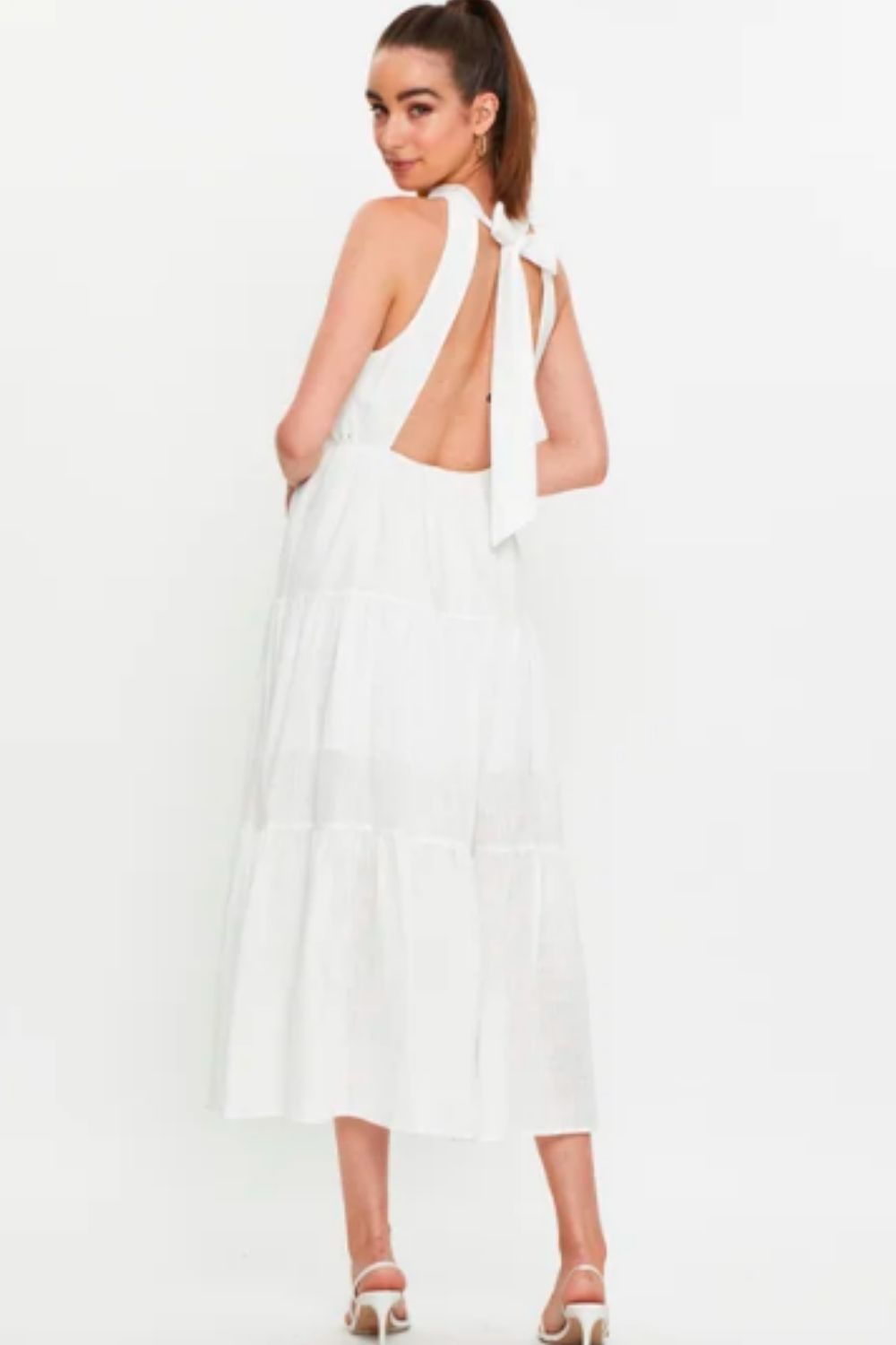 SKU:HalterNeckBacklessRuffleDressWhite-XS