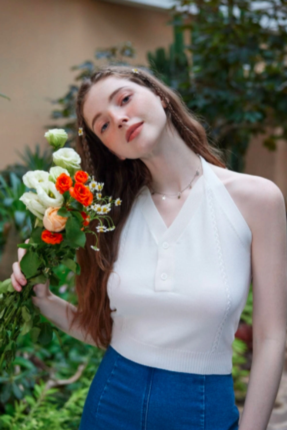 Halter Neck Button Open Front White Crop Top