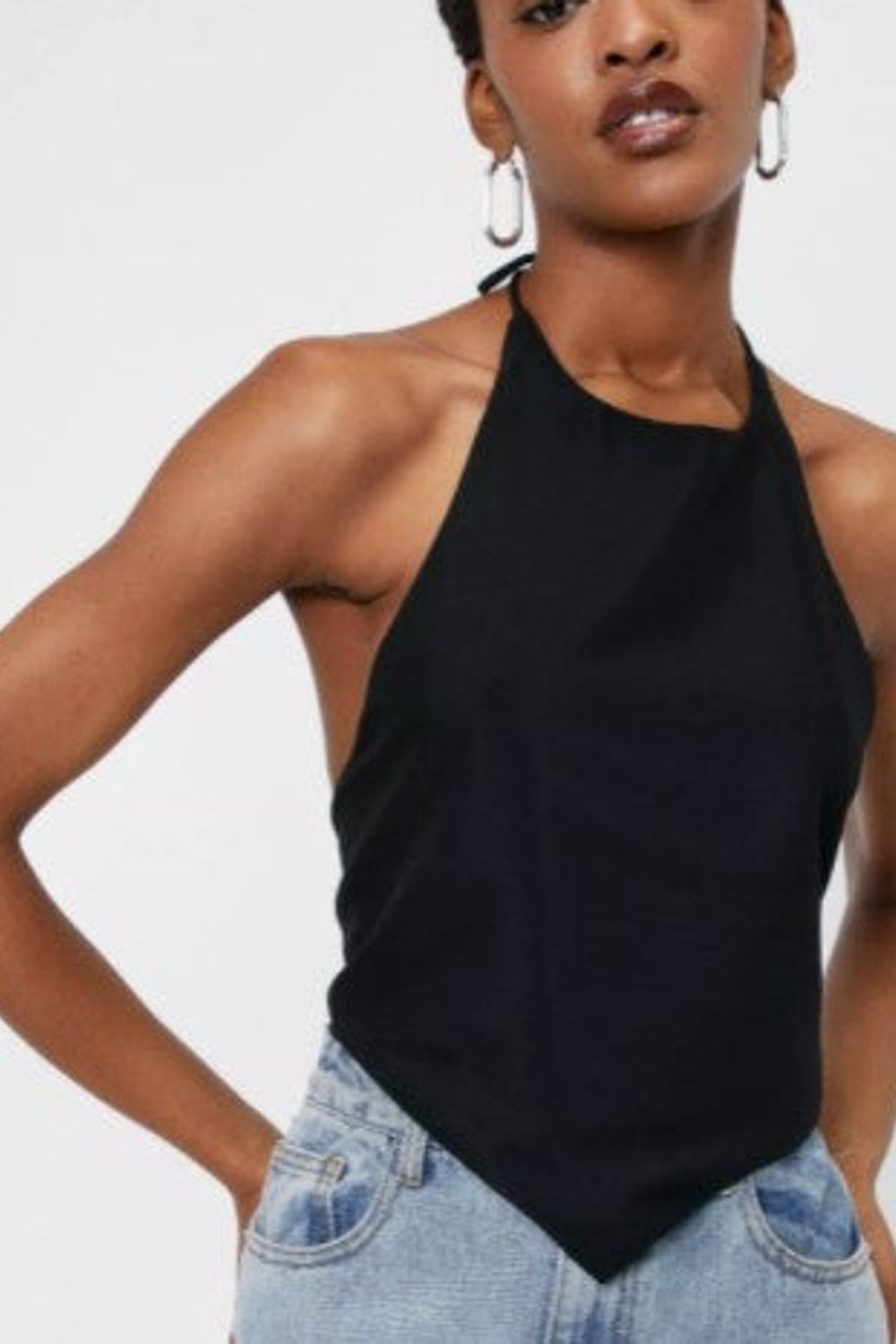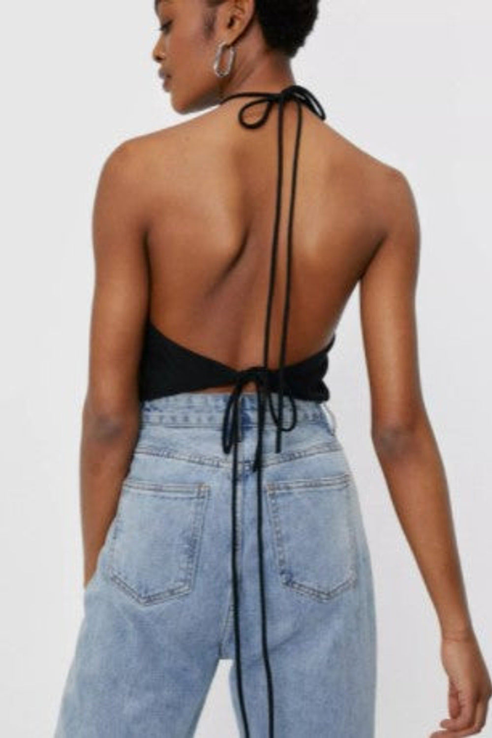 In timeless black, this Halter Tie Open Back Crop Top is a wardrobe staple that effortlessly transitions from day to night. Its flattering regular fit silhouette complements all body types, while the rib fabric adds a touch of texture and sophistication.