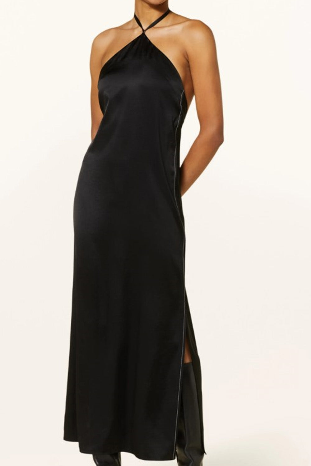 Type-Harmony Black Dress, Color-Black, Neck type-Halter neck, Sleeve Length-Sleeveless, Fit-Relaxed, Fabric-Satin