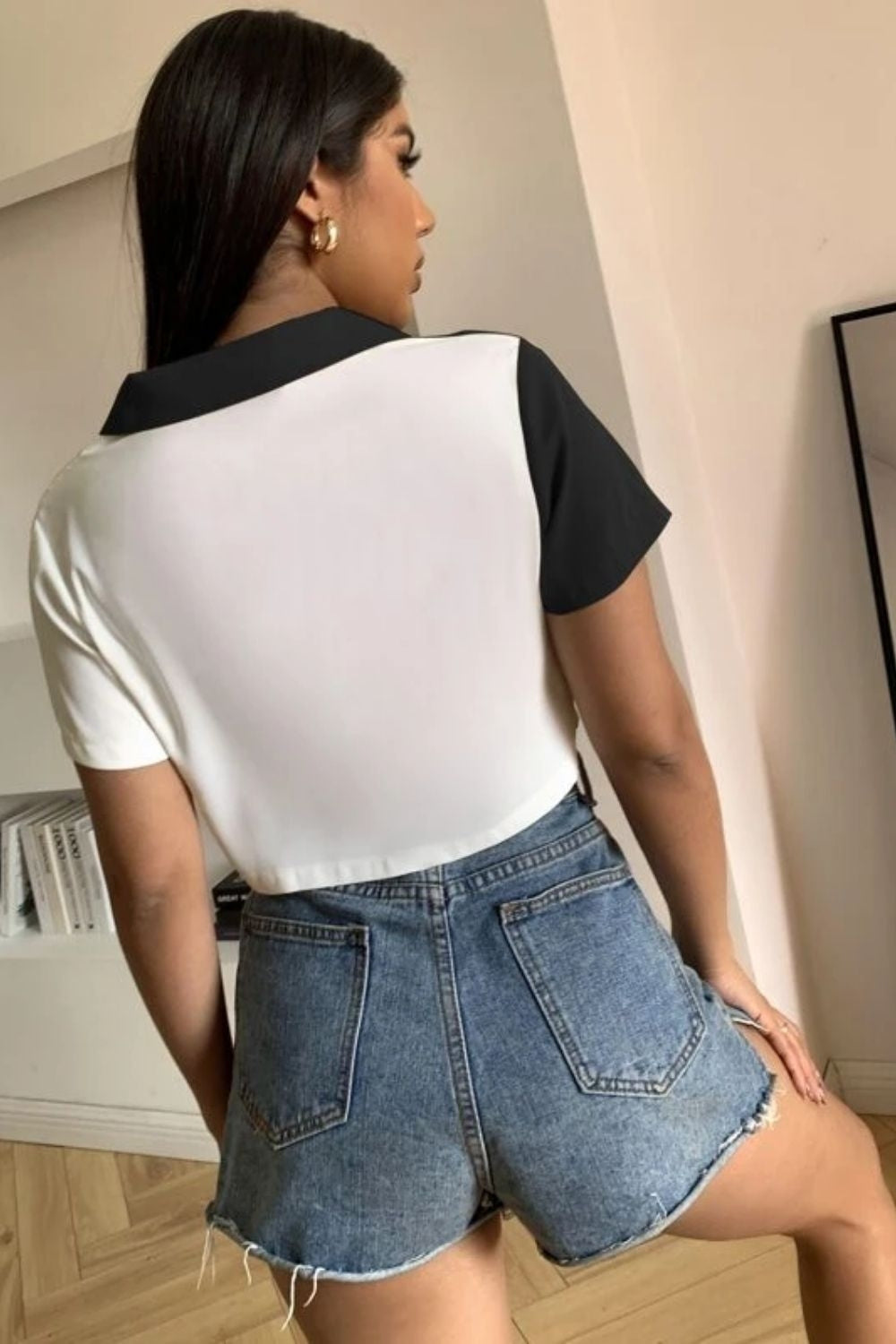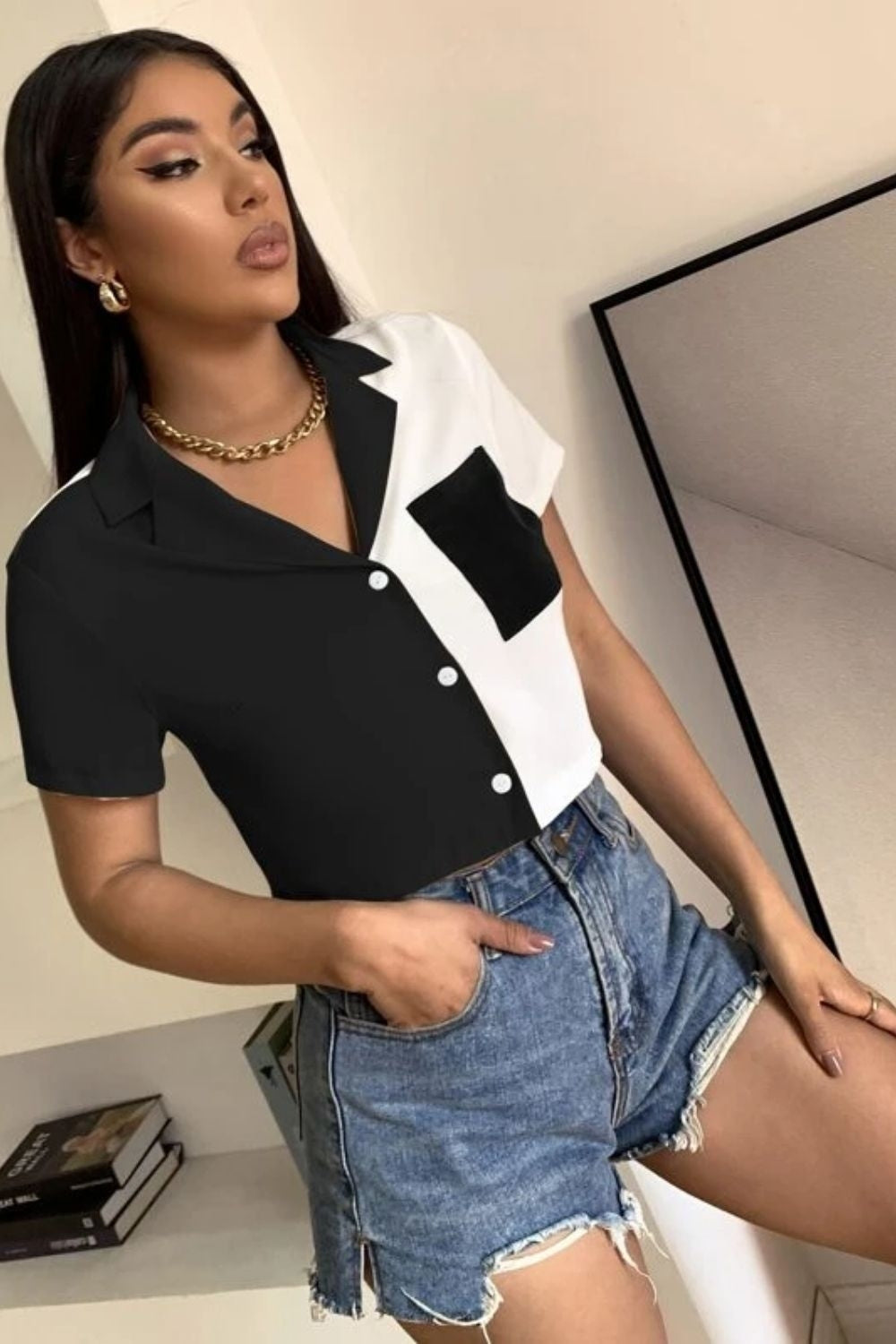 The classic collar adds a polished touch, making it suitable for both casual and semi-formal settings. The black and white color combination creates a striking contrast that effortlessly elevates your overall aesthetic. The shirt is designed to be easily paired with your favorite jeans, chinos, or shorts, making it a versatile piece for your summer wardrobe.