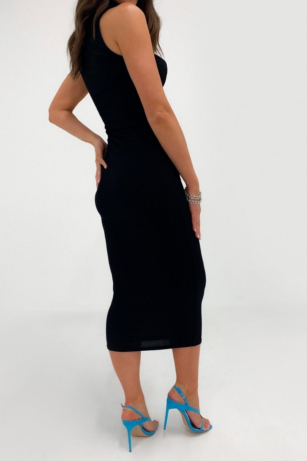 SKU:HighNeckCutDetailInTheFrontBlackMidaxiDress-XS