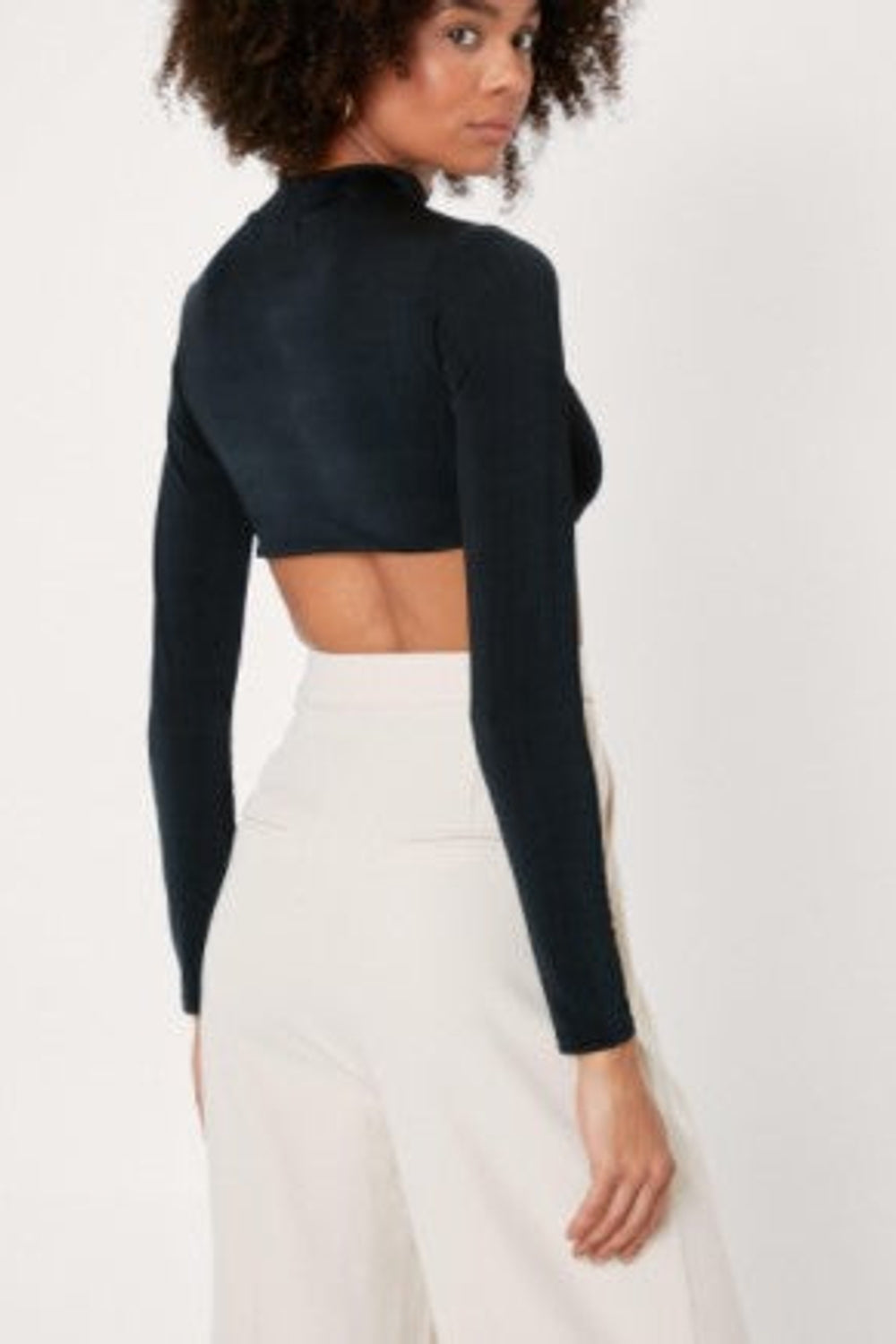 Pair it with high-waisted jeans and statement earrings for a casual yet chic daytime look. Transition seamlessly into evening by swapping out the jeans for a sleek skirt and adding some bold heels. With its classic black color, this crop top serves as the perfect canvas for accessorizing, allowing you to unleash your creativity and express your unique sense of style.