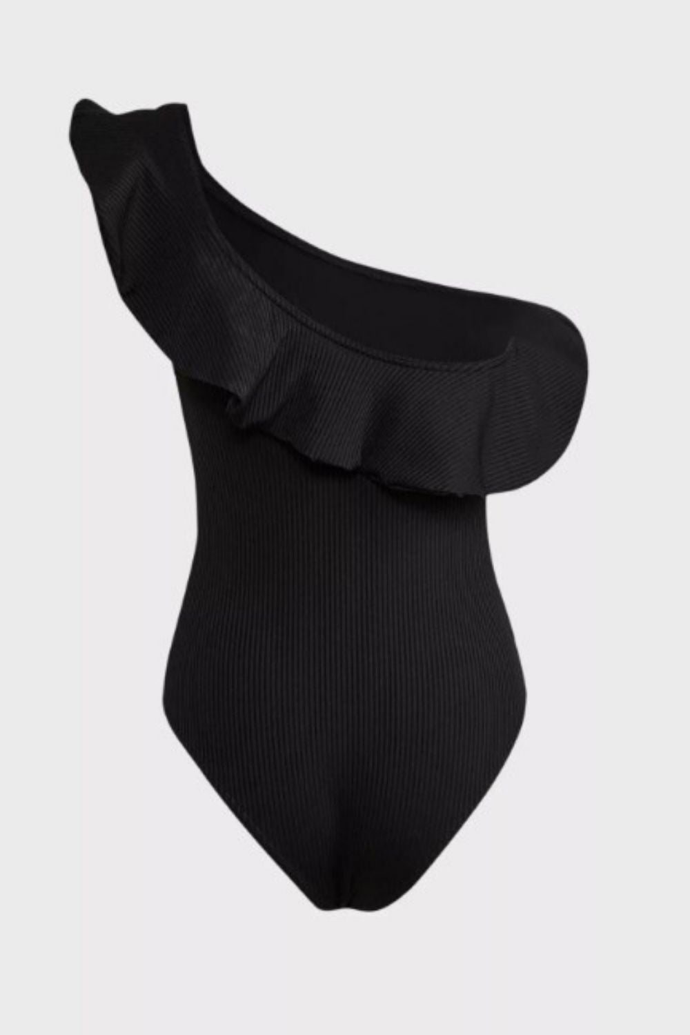Honey Asymmetric Shoulder Black Ruffled Body Suit