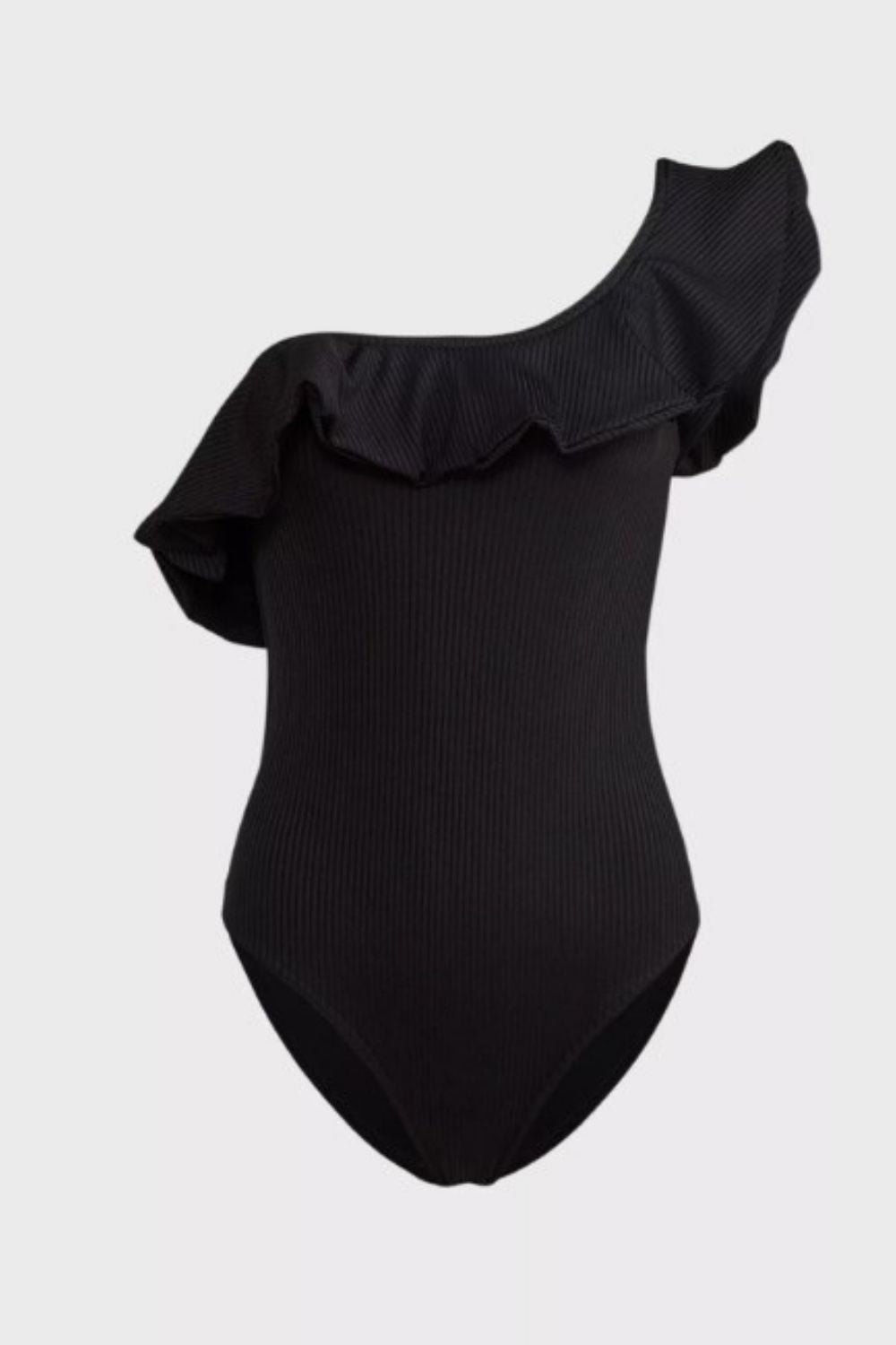 Type- Honey Asymmetric Shoulder Black Ruffled Body Suit