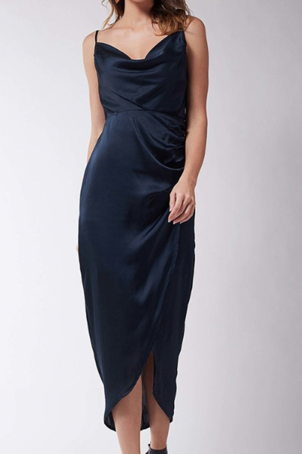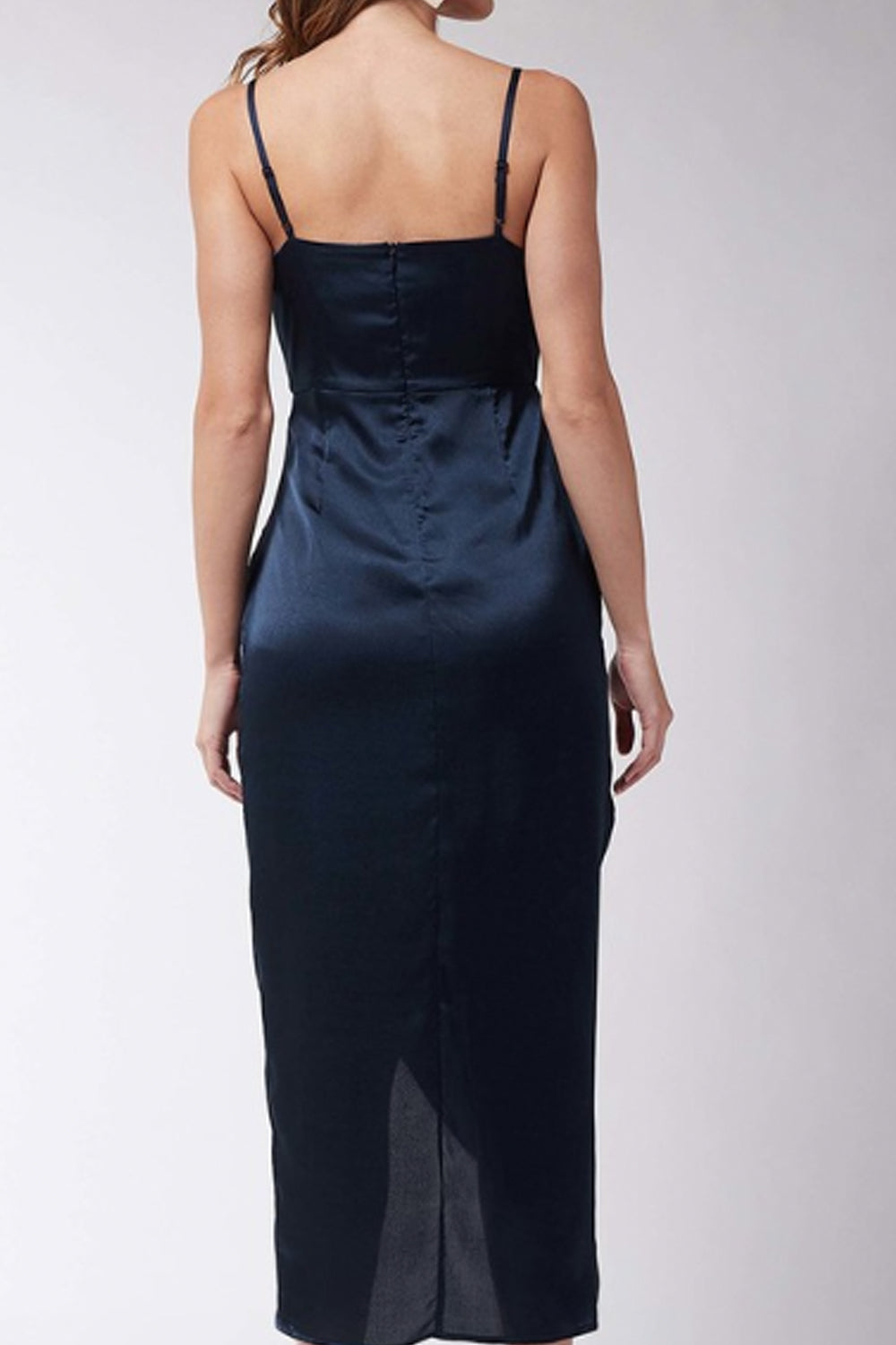 Type-Hoxton Navy Blue Dress Color-Navy Blue Neck type-Sweetheart neck Sleeve Length-Sleeveless Fit-Body Fit Fabric-Satin