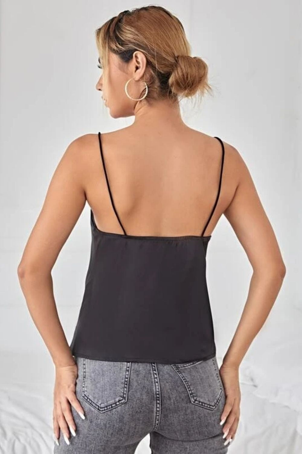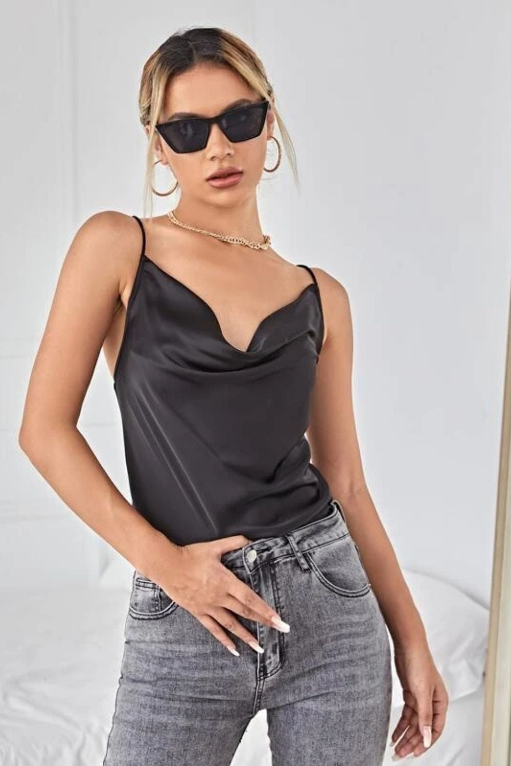 Product Description: Crafted from luxurious satin fabric, the In Tune Black Top not only looks stunning but also feels incredibly soft against your skin. The cowl neck design adds an element of glamour, creating a flattering silhouette that effortlessly complements your figure. The sleeveless cut is ideal for warm summer days, allowing you to stay cool and comfortable while making a bold fashion statement.