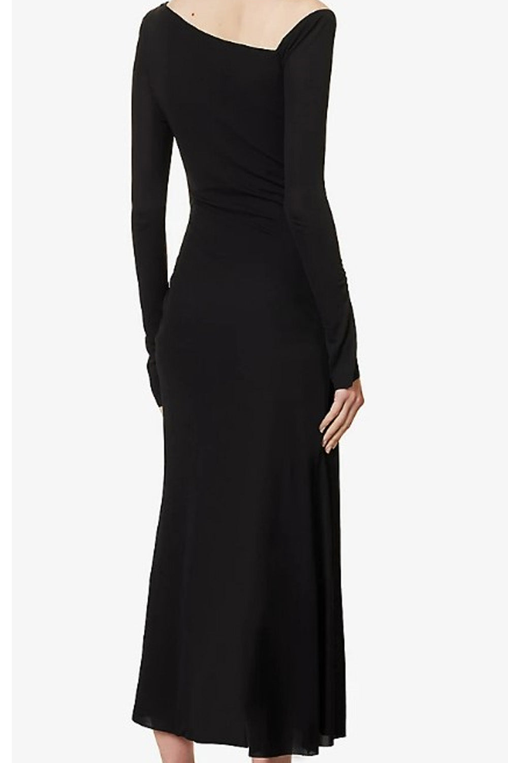 Type-Incandescent Black Dress, Color-Black, Neck type-Asymmetric neck, Sleeve Length-Full sleeve, Fit-Body Fit, Fabric-Poly Lycra