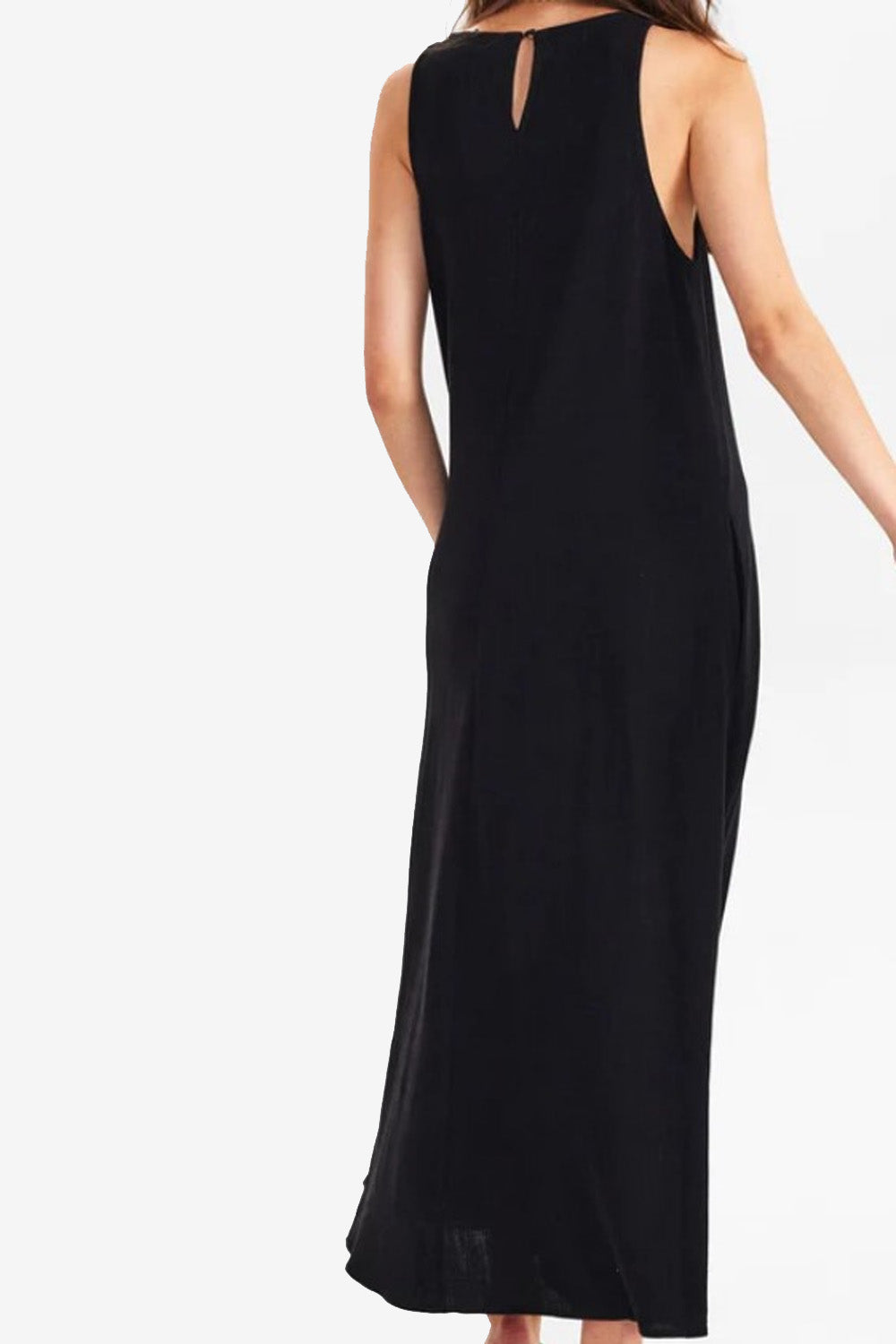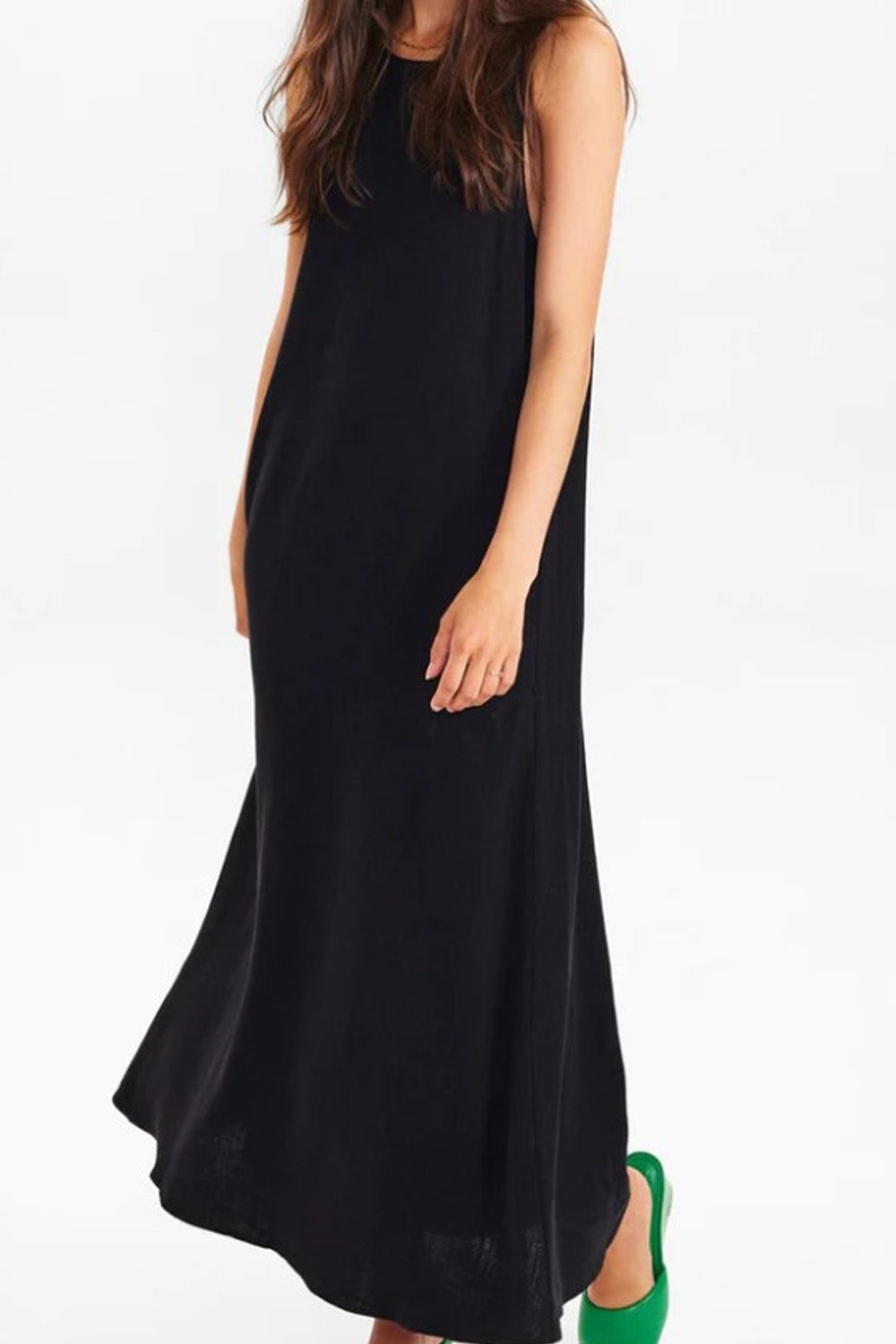 Type-Ineffable Black Dress, Color-Black, Neck type-Round neck, Sleeve Length-Sleeveless, Fit-Relaxed, Fabric-Rayon