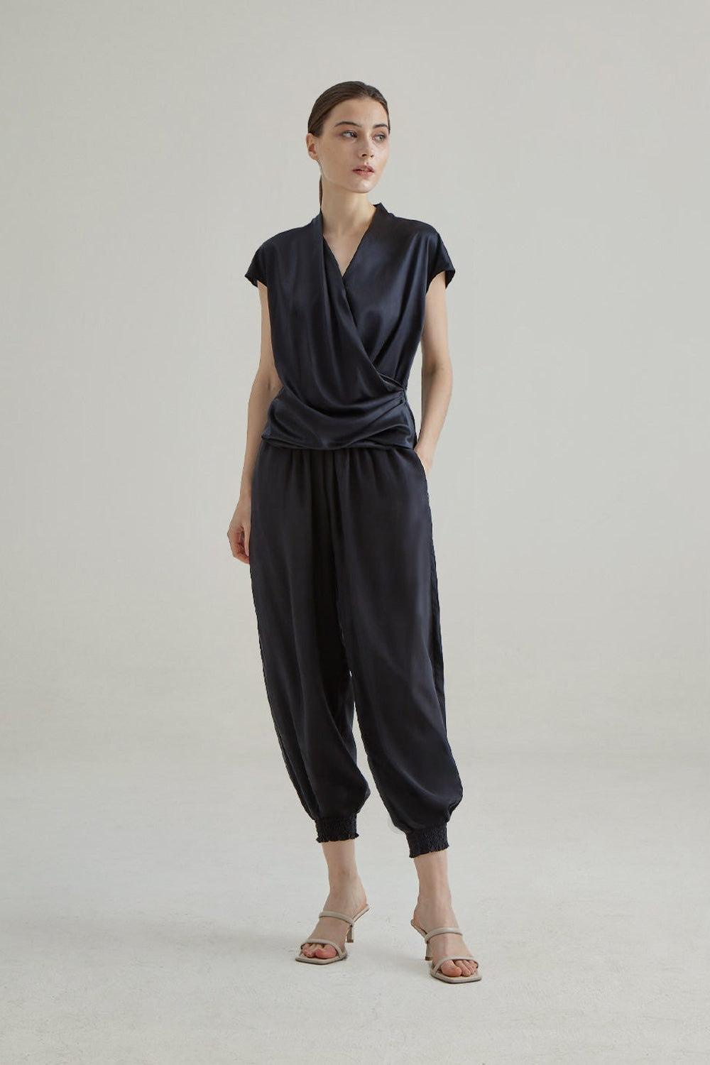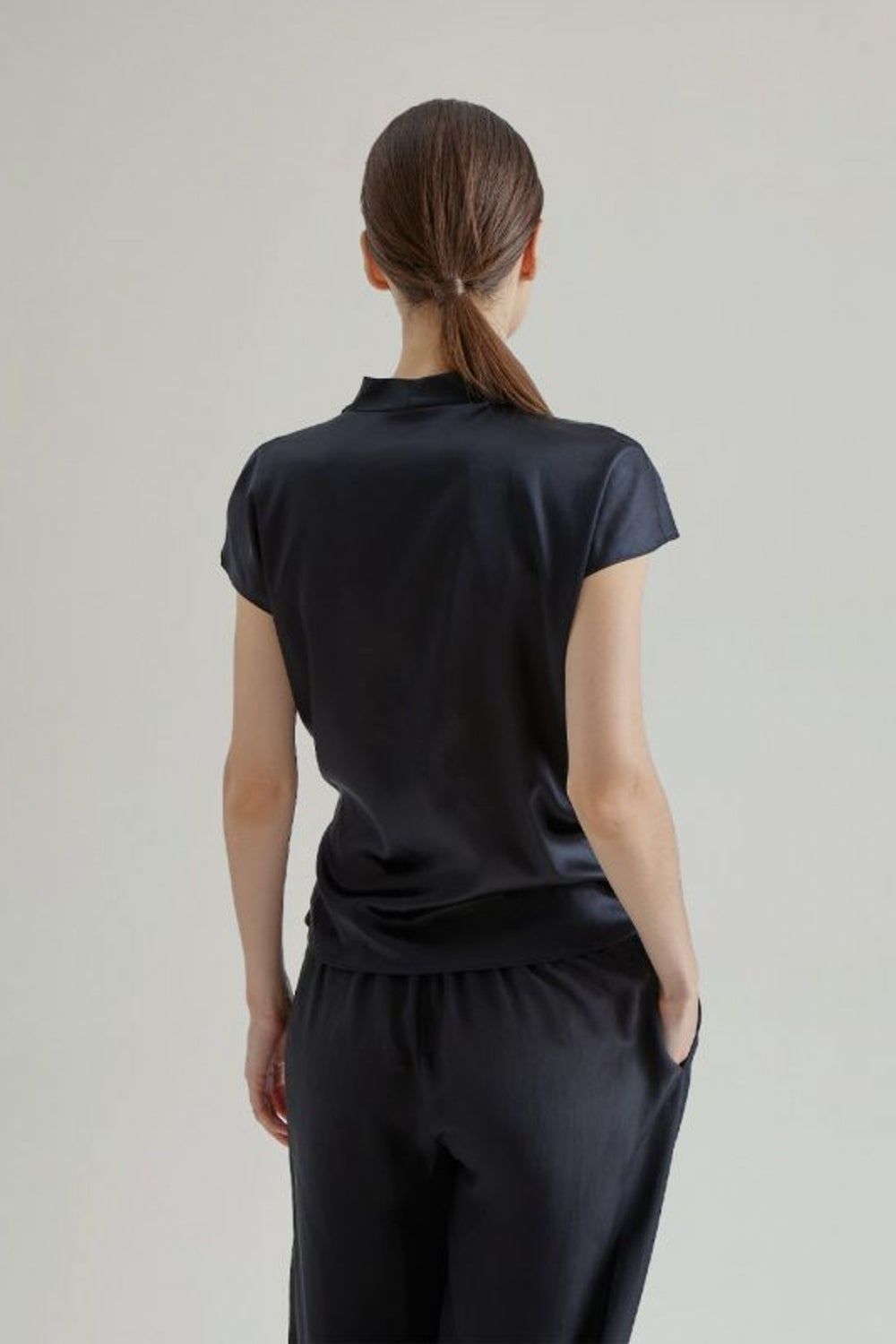 With its versatile design and timeless appeal, our Irregular Pleated Short Sleeve Silky Blouse Top in black is a must-have addition to your summer wardrobe. Elevate your style effortlessly with this wardrobe essential.