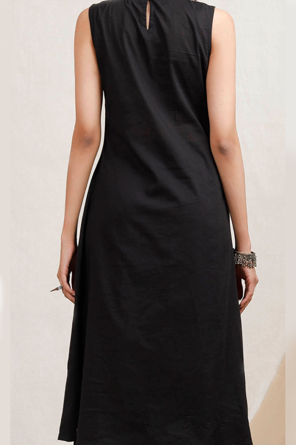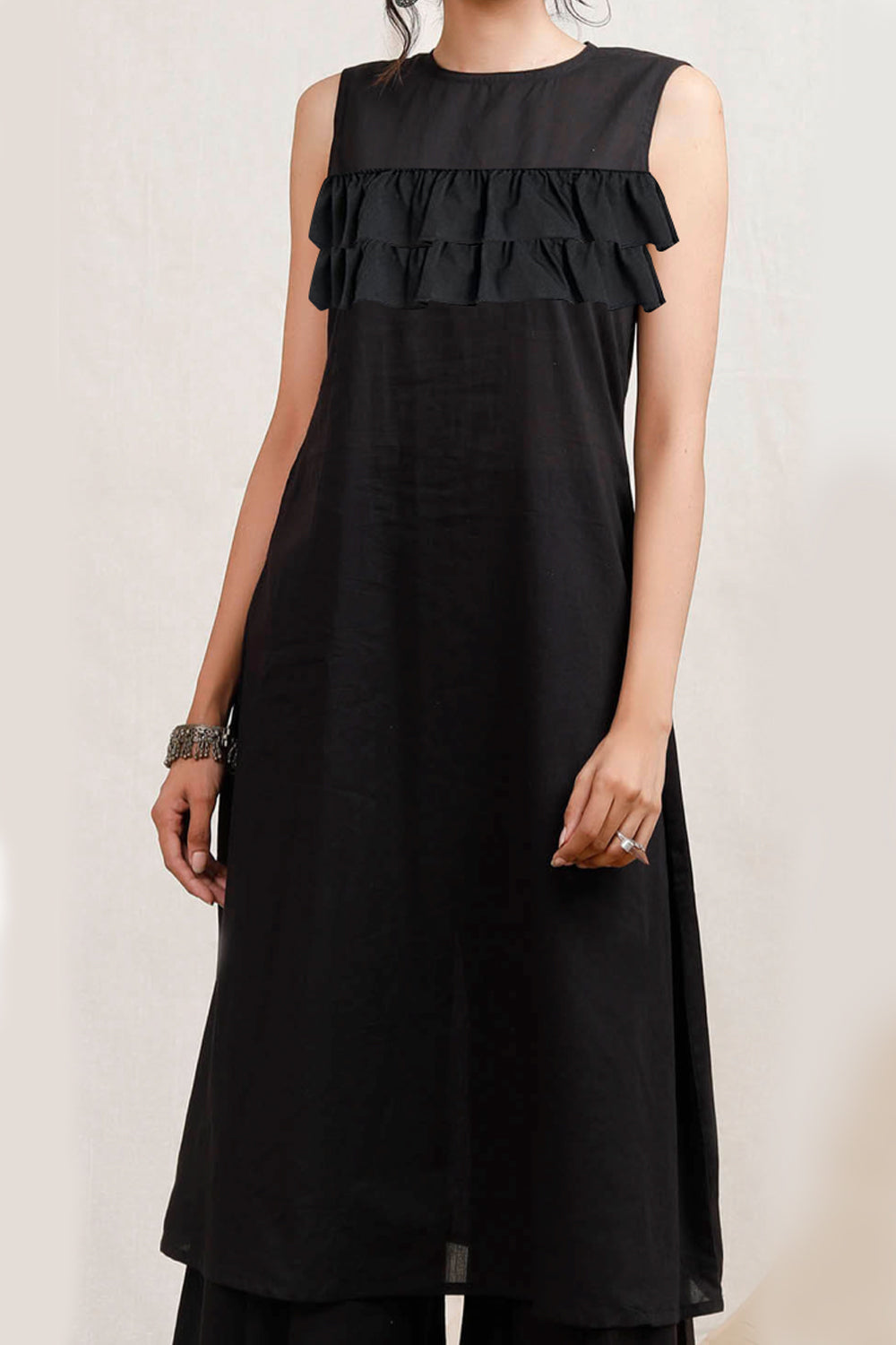Black kurta | Knee length | Black ruffles on chest | Back opening | Sleeveless