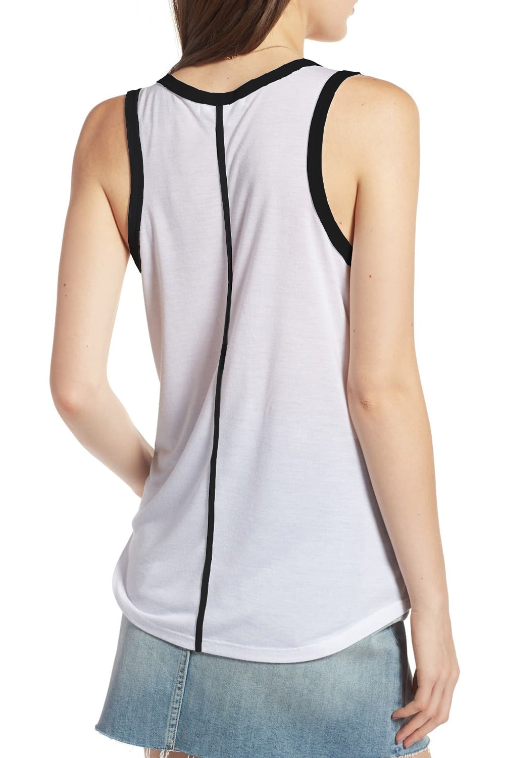 A tank white tank top with black piping running through the neckline. A graphic print is stamped on to the front of the top and the back is joined together with a strip of black. The top is made from cotton single jersey.