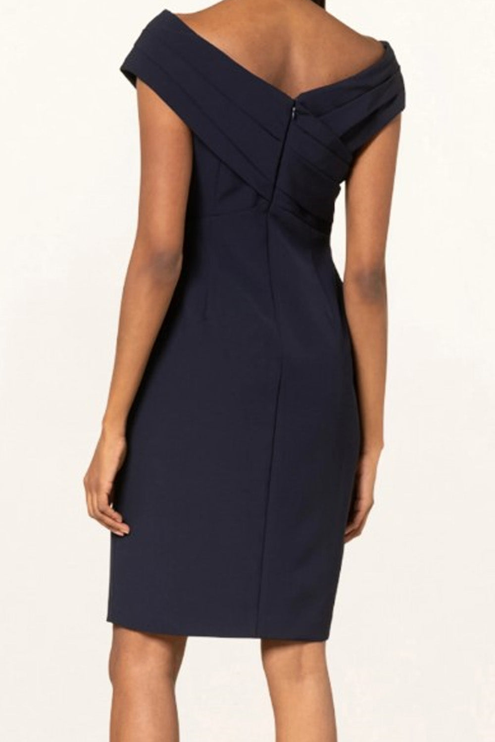 Type-Jovial navy Dress, Color-navy, Neck type-Off- shoulder neckline, Sleeve Length-Sleeveless, Fit-Body Fit, Fabric-Crepe