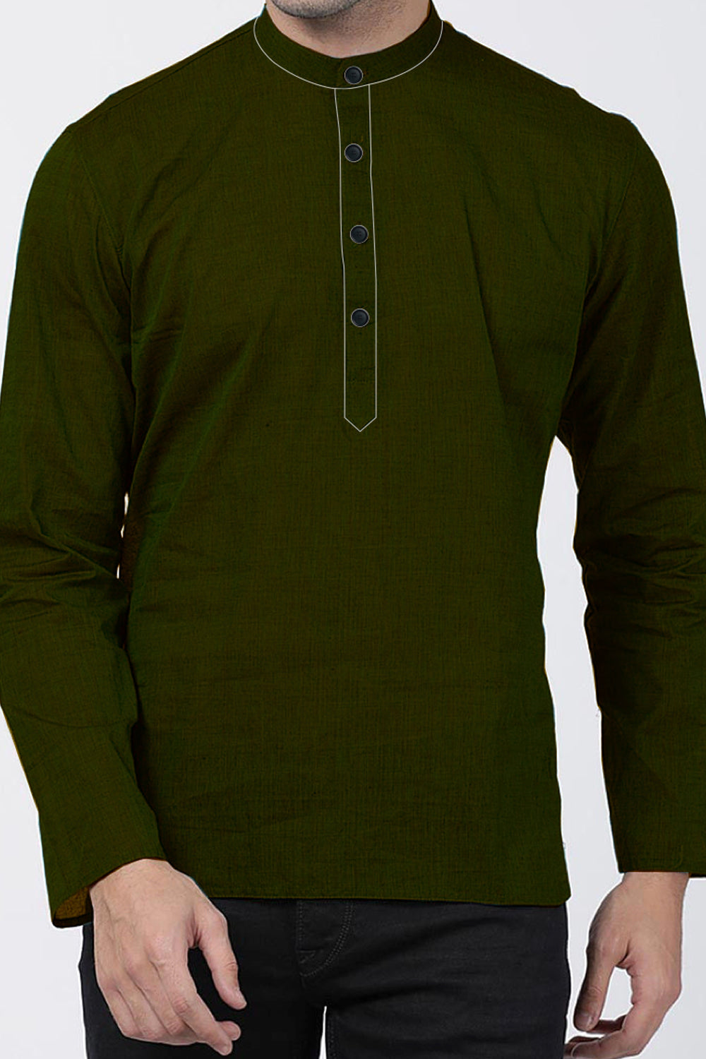 Olive green ethnic | Full sleeve | Contrast raw silk edging for collar | Shirt length |
