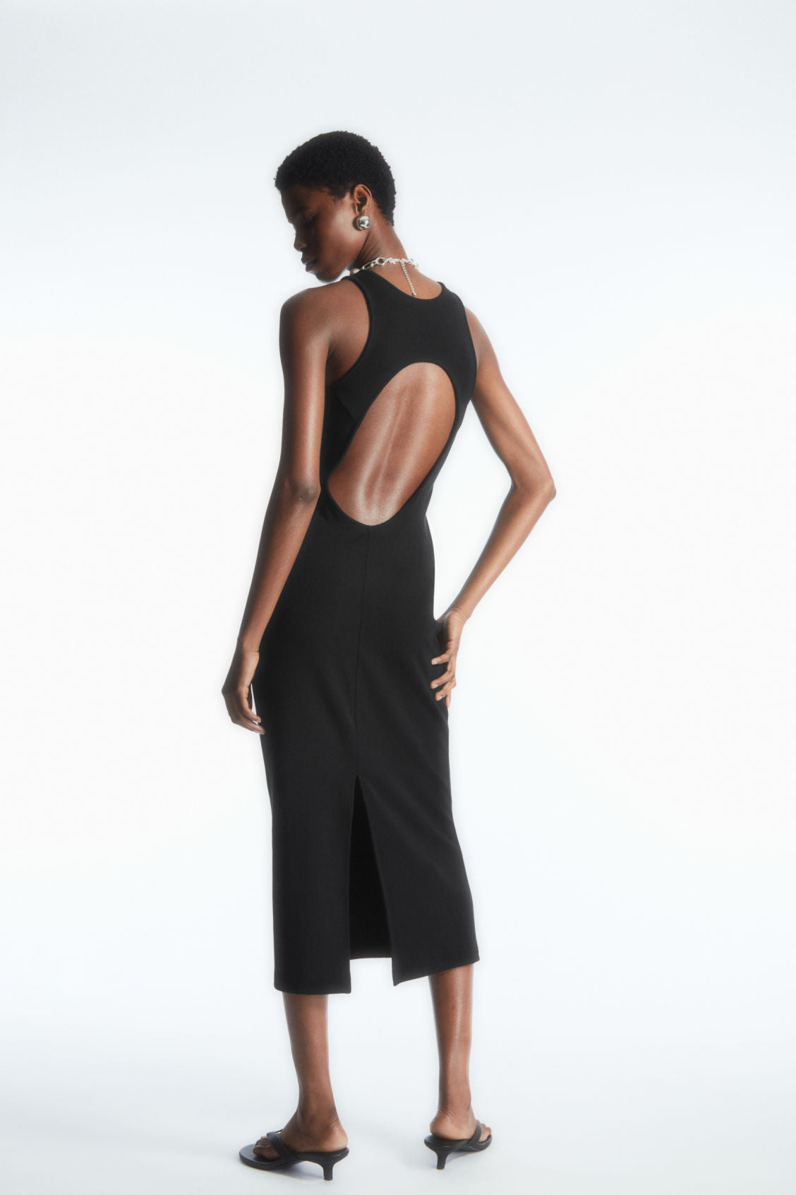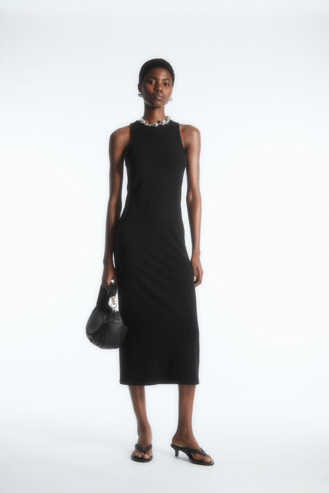 Type-Khabarovsk Black Dress, Color-Black, Neck type-Close neckline, Sleeve Length-Sleeveless, Fit-Body Fit, Fabric-Rib