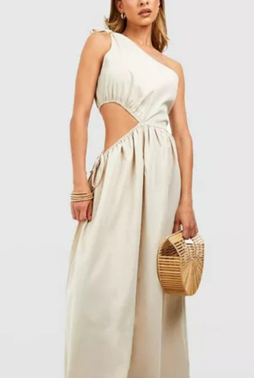 Type-Knot Cream Dress, Color-Cream, Neck type-Asymmetric neck, Sleeve Length-Sleeveless, Fit-Regular, Fabric-Poplin