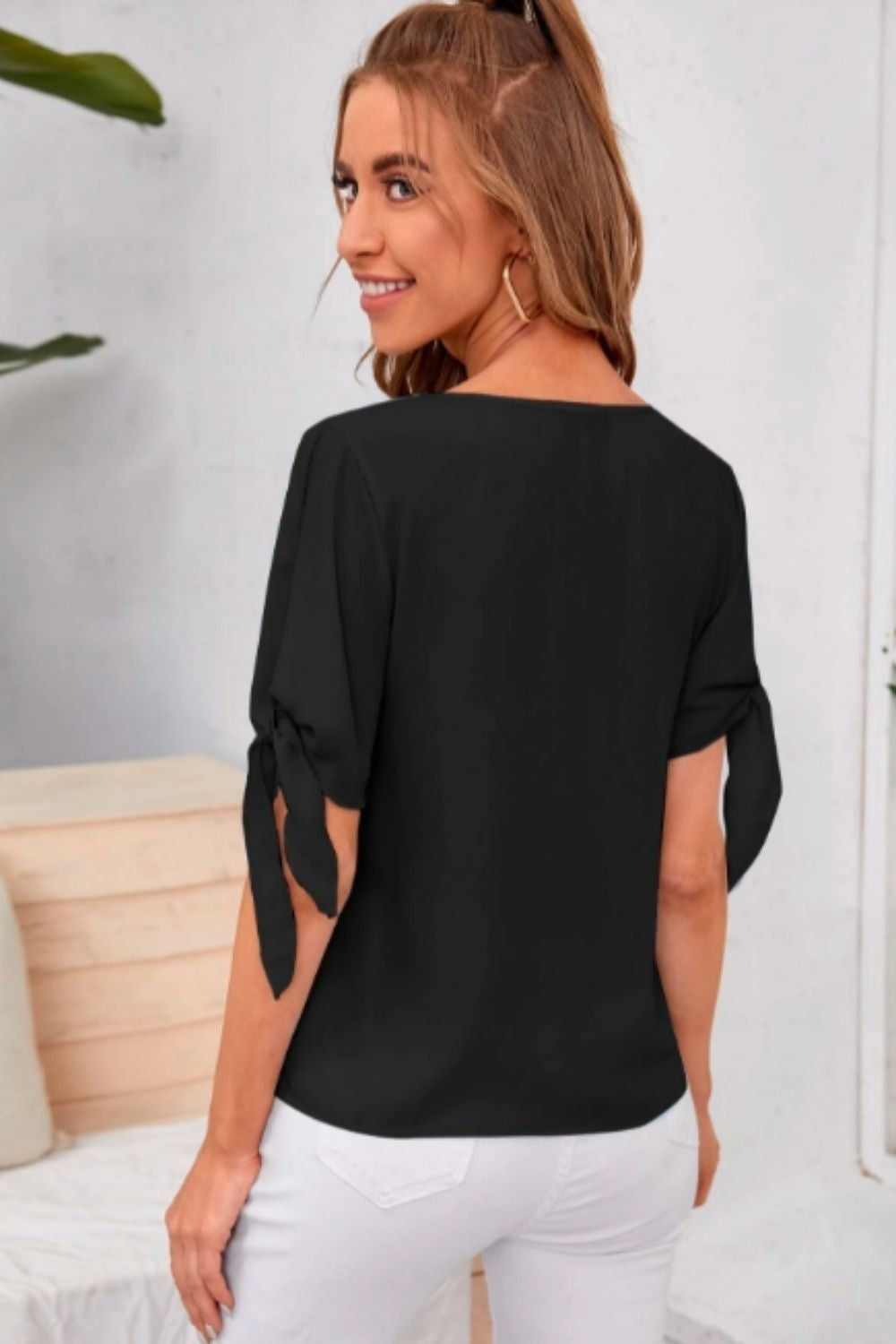 SKU:KnotCuffSolidBlouse-XS