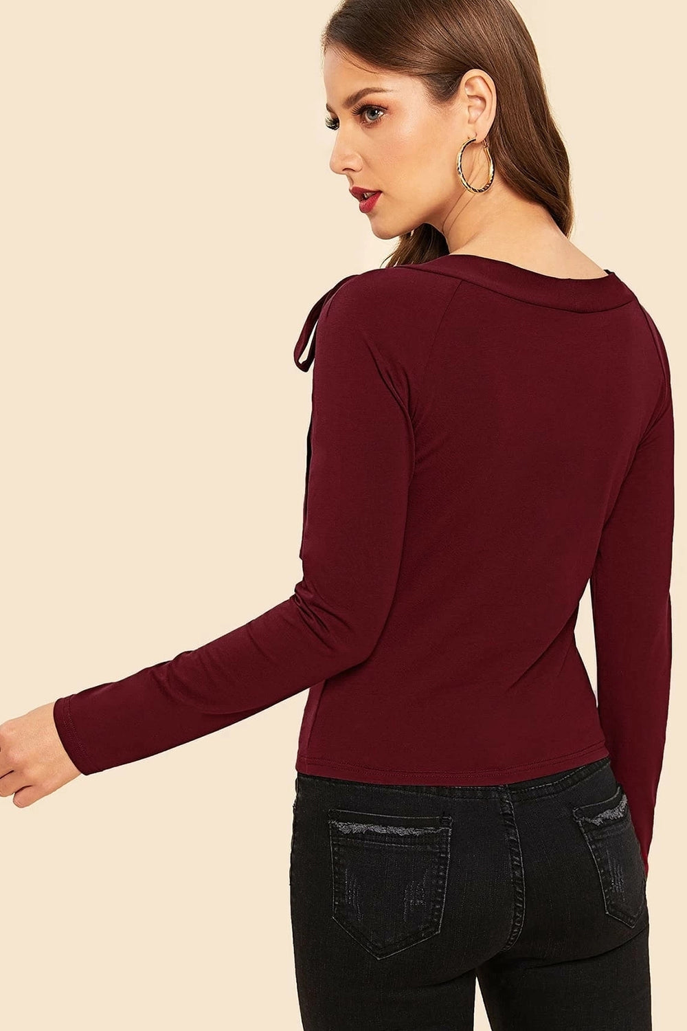 This fancy maroon top with a cut around the shoulder and a knot is extremely stylish and fashionable.