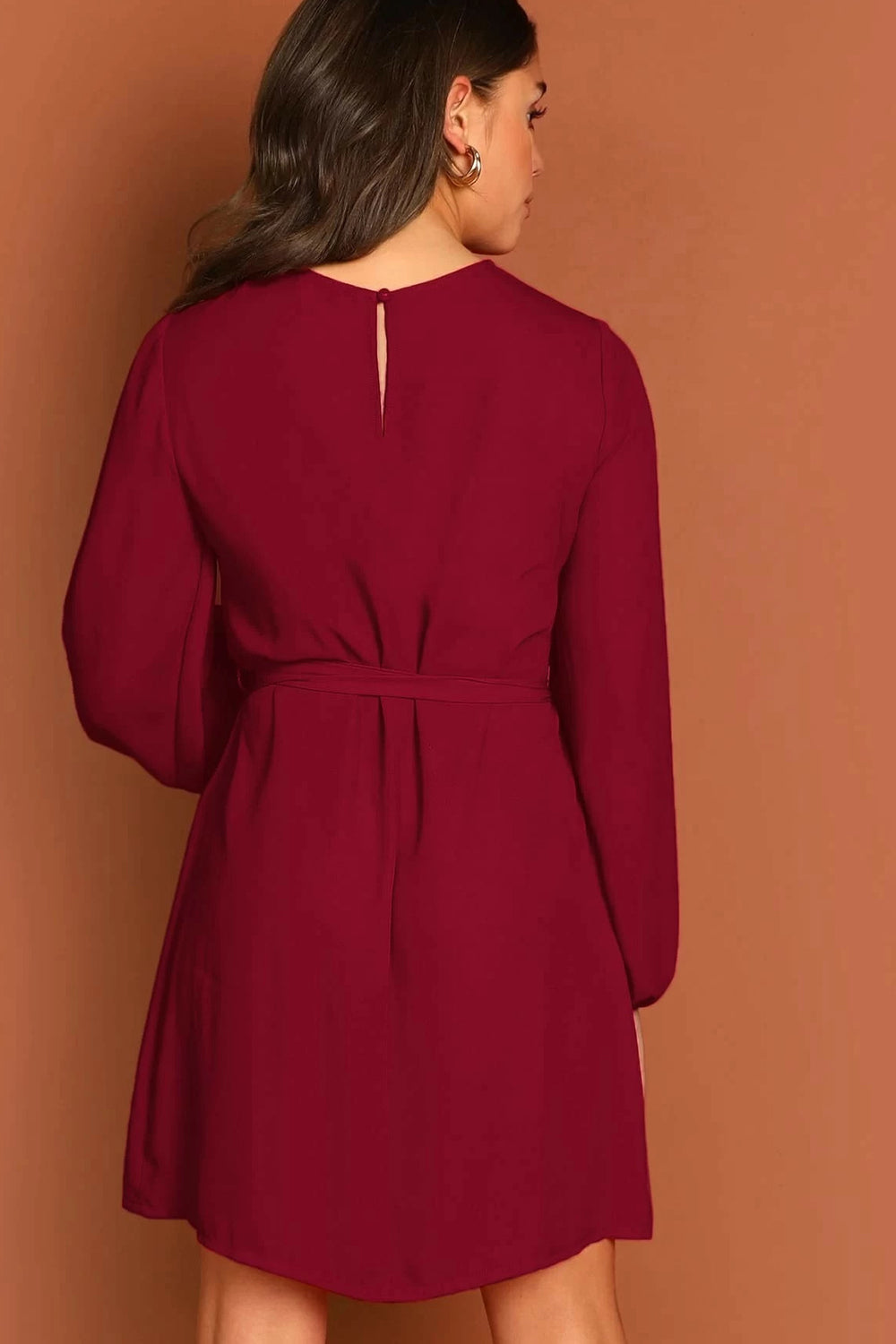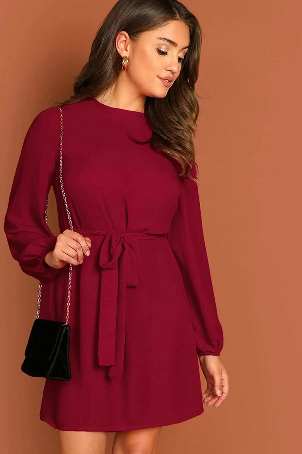 This maroon dress with full sleeve will make you fall in love with you once you wear it. Featuring close neck and knot detail at the waist.
