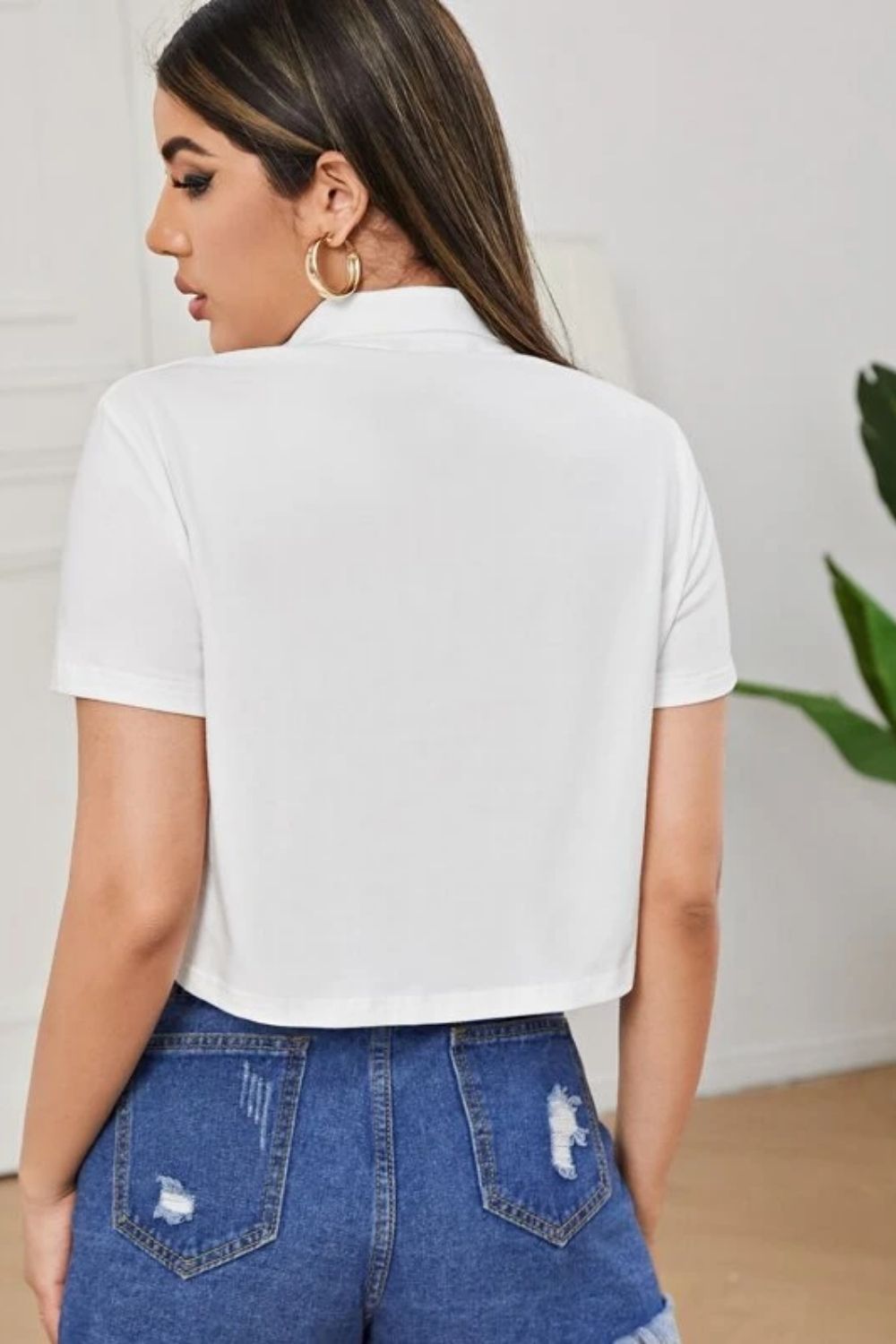 Introducing the "Living It White Print Top" – a wardrobe essential that seamlessly combines classic style with comfort. This short sleeved top is designed for the modern woman who embraces simplicity and elegance. With its crisp white color, collar neckline, and regular fit, the Living It White Top effortlessly transitions from casual outings to more polished occasions.