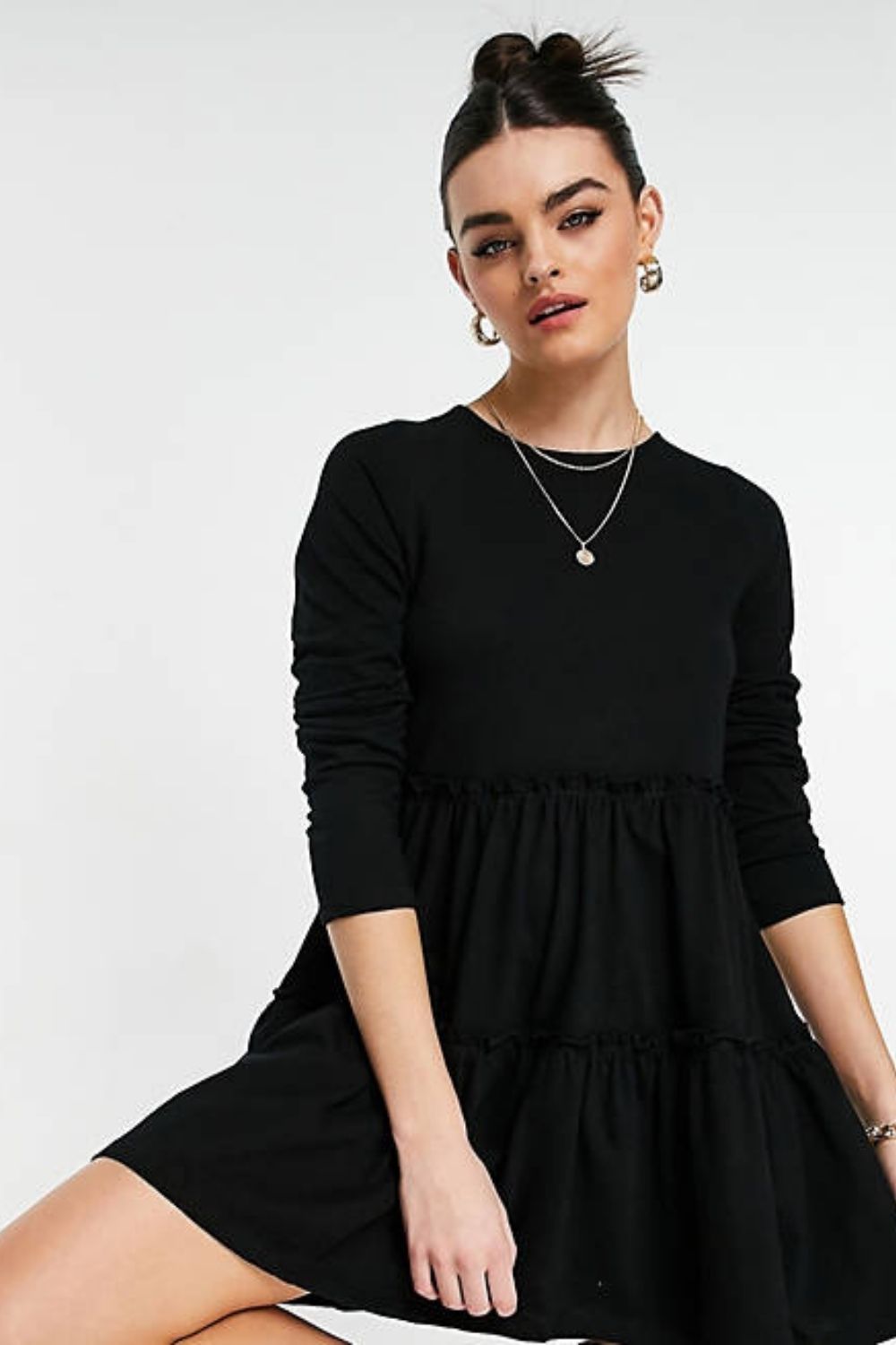Long Sleeved Tiered Smock Mini TShirt Dress In Black