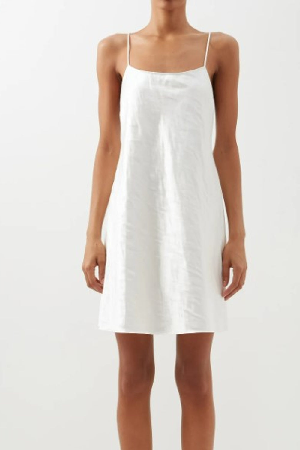 Type-Longueuil White Dress, Color-White, Neck type-Square neck, Sleeve Length-Sleeveless, Fit-Regular, Fabric-Satin Lycra