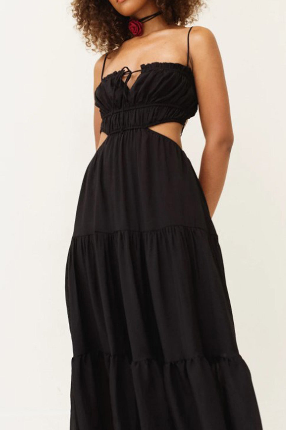 Type-Lovely Black Dress, Color-Black, Neck type-Square Tie neck, Sleeve Length-Sleeveless, Fit-Regular, Fabric-Crepe