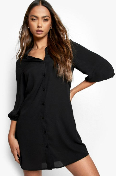 Elevate your summer wardrobe with the Lowry Black Puff Sleeve Shirt Dress. Crafted from lightweight and breathable georgette fabric, this dress ensures you stay cool and comfortable even on the warmest days. The classic black hue adds a touch of sophistication, making it suitable for various occasions.